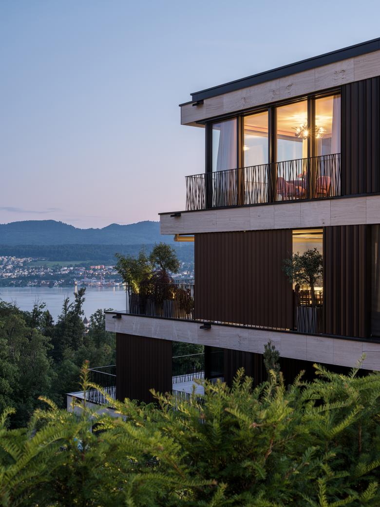 Die Architektur zeichnet sich durch eine klare und kubische Form aus und steht im Gegensatz zur umgebenden «wilden» Natur. Die Materialisierung ist geprägt von beigen Travertin-Naturstein einerseits, andererseits von einem bronzefarbigen unregelmässig gewellten Fassadenblech. Die feinen Staketengeländer bilden zusammen mit den raumhohen Lamellen das dritte fassadenbildende Element. Alle drei Elemente fügen sich zu einer hochwertigen und wohl austarierten Komposition zusammen. Der klaren und schnörkellosen architektonischen Gestaltung wird eine naturbelassene Umgebung gegenübergestellt, welche so den Bezug zum naheliegenden Wald und Tobel herstellt.