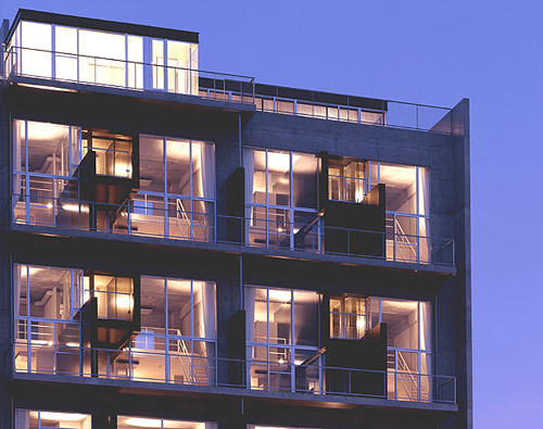 SOHO style housing located at Fukuoka's bay front area. High ceiling space allows for lofts, two story units, and dramatic views of the Bay.