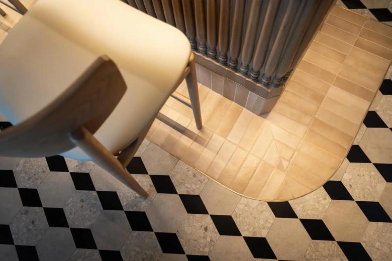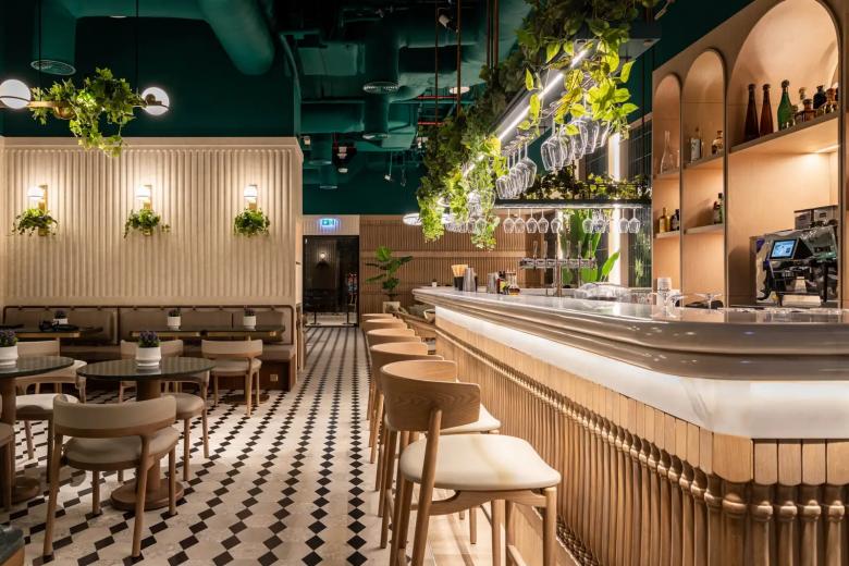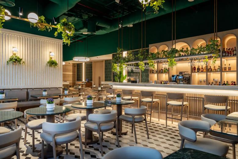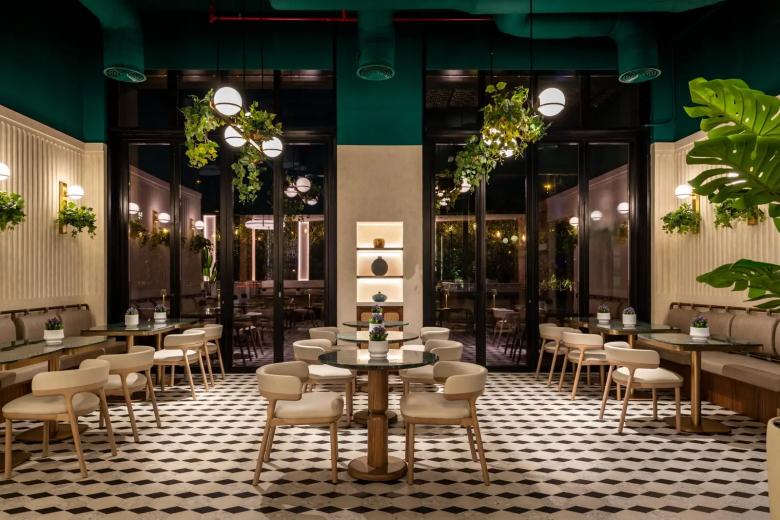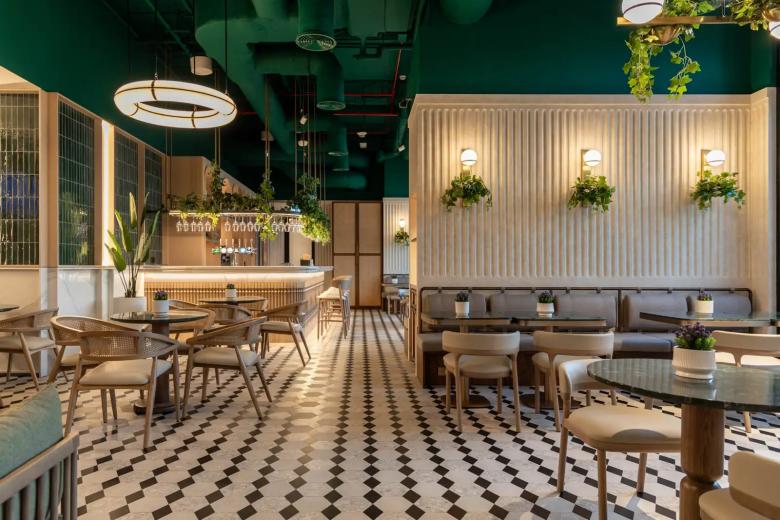 The interiors are anchored by a bold emerald ceiling that draws the eye upward, while creamy fluted wall panels and geometric black-and-white floor tiles ground the space with texture and rhythm. A palette of natural wood, brushed brass, and soft greenery ensures a balanced atmosphere that adapts seamlessly from daytime brunches to atmospheric evening cocktails.