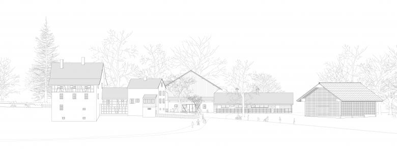 Die neue, freistehende Remise schafft es, den Hofraum besser zu fassen, und definiert einen klaren Abschluss des Weilers nach Westen. Dadurch wird auch der Hofverkehr nahe der Badstrasse an der Nordseite konzentriert und das Betriebszentrum um das Menzihaus gestärkt. Die Scheune mit Hocheinfahrt bleibt als Zeitzeugin und prägendes Volumen erhalten.