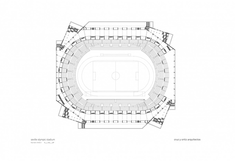 Deprimiendo el nivel de la pista deportiva respecto al perfil natural del terreno, se permite el acceso al estadio a una cota intermedia, por lo que los desniveles a salvar por los espectadores se reducen y se disminuyen a su vez los problemas de evacuación. De este modo, se proyectó un edificio de silueta tendida que al incorporar otros usos -hotel y oficinas adopta exteriormente un perímetro anguloso y quebrado, muy diferente del obligadamente continuo y oval de graderíos y cubierta.