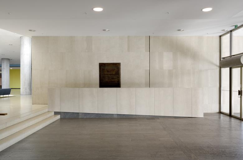 Das Haus der Kulturen der Welt – auch bekannt als „Schwangere Auster“ – wurde zur Internationalen Bauausstellung INTERBAU 1957 als Kongresshalle nach einem Entwurf von Hugh A. Stubbins errichtet. Heute ist das denkmalgeschützte Gebäude ein Ausstellungsort für internationale, zeitgenössische Künste und ein Forum für aktuelle Entwicklungen und Diskurse. Die zweite Teilinstandsetzung und Modernisierung umfasst neben sicherheitsrelevanter Maßnahmen im Wesentlichen die Modernisierung des Auditoriums und des Vortragssaals, die Flexibilisierung der historischen Bestuhlung in den beiden vorgenannten Räumen, die Installation eines neuen Wegeleitsystems, und die Instandsetzung der Hirschfeldbar sowie die Neuerrichtung einer Ausstellungshalle. Dabei steht der behutsame Umgang mit der denkmalgeschützten Bausubstanz im Vordergrund. Zahlreiche Einbauten und Oberflächen werden restauriert, verbleiben im Original und erhalten so den ursprünglichen, historischen Charakter des Gebäudes. Die Holzelemente des Auditoriums, der Hirschfeldbar im unteren Foyer sowie der Garderobe im oberen Foyer werden abgetragen, aufgearbeitet, gereinigt sowie mit neuester Technik versehen. Das neukonzipierte Wegeleit- und Informationssystem für die öffentliche Bereiche erfolgt über Projektionen auf ausgewählte Wand- und Bodenflächen. Zur weiteren Orientierung werden zusätzliche Raumbeschriftungen angebracht, die sich an dem historischen Vorbild orientieren und im Aluminiumgußverfahren hergestellt werden. Das Konzept setzt auf eine Fortschreibung und Weiterentwicklung der Qualitäten des Hauses, insbesondere der Offenheit, der fließenden Übergänge und inszenierten Raumfolgen.