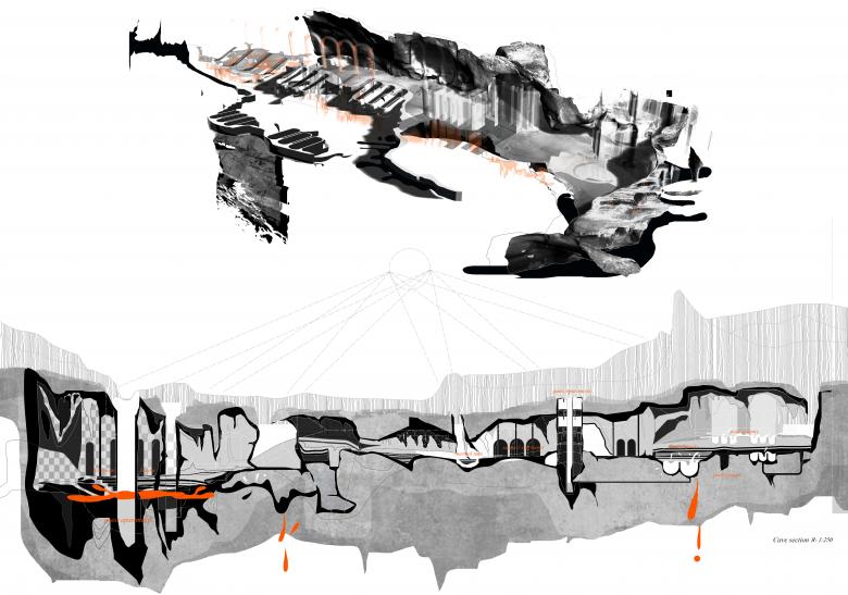 The design introduces new spatial elements, which are carefully integrated into the existing cave structure without disrupting its delicate ecological balance. These elements function as contemporary 'beaches' within the cave. Since this cave consists of multiple levels - These additions are intended to merge seamlessly with the cave’s natural conditions, ensuring that the intervention complements rather than competes with the geological and ecological integrity of the site. Salt rooms, thermal pools, saunas and other additions strategically follow the natural underground streams and cave walls. All walking paths within the cave are also designed to follow the natural contours of the terrain, integrating viewing platforms and resting spots that allow visitors to fully appreciate the interplay of light, shadow, and form within the space.