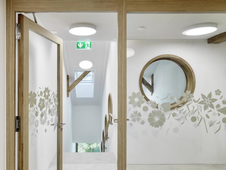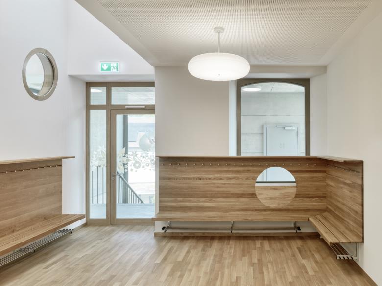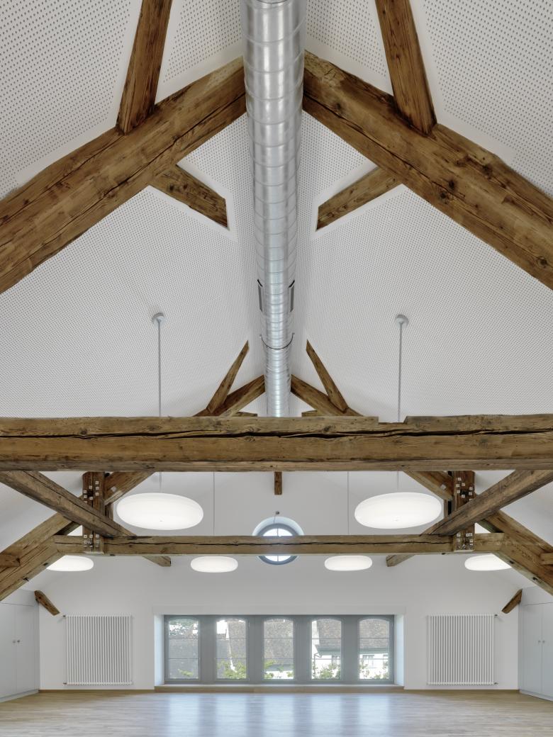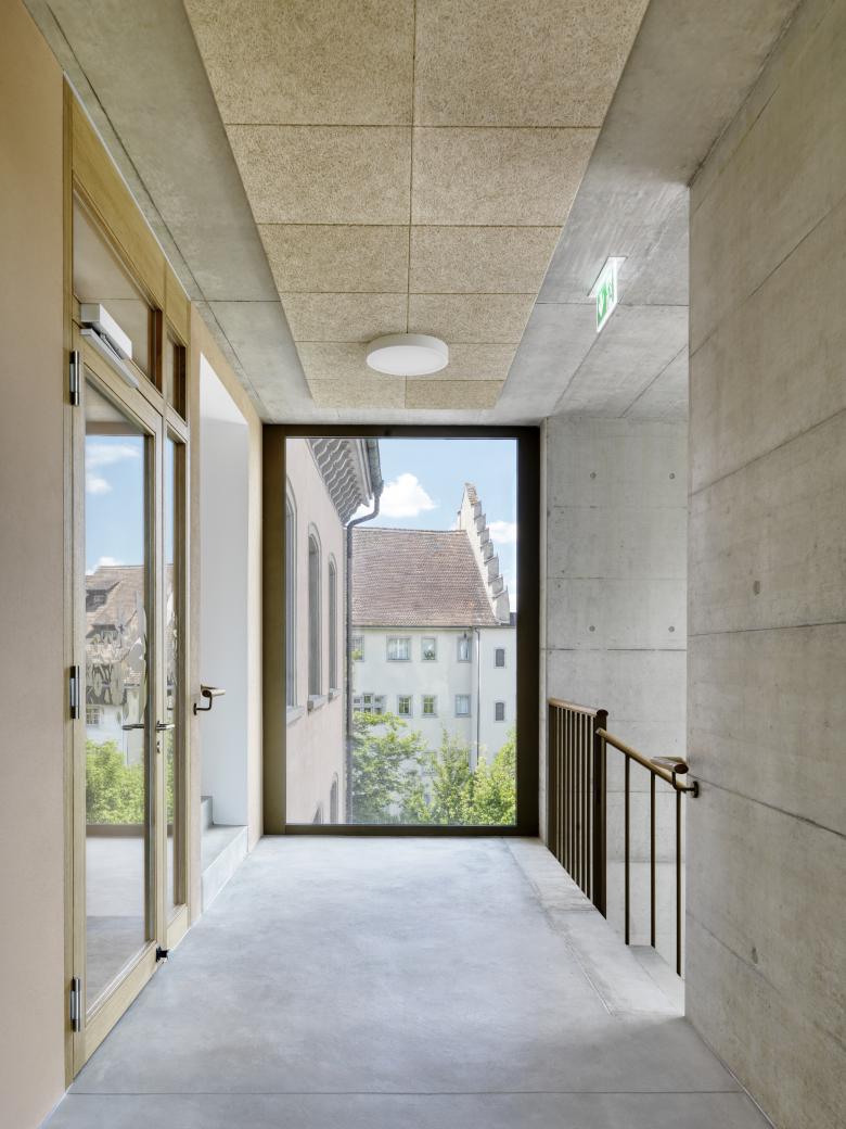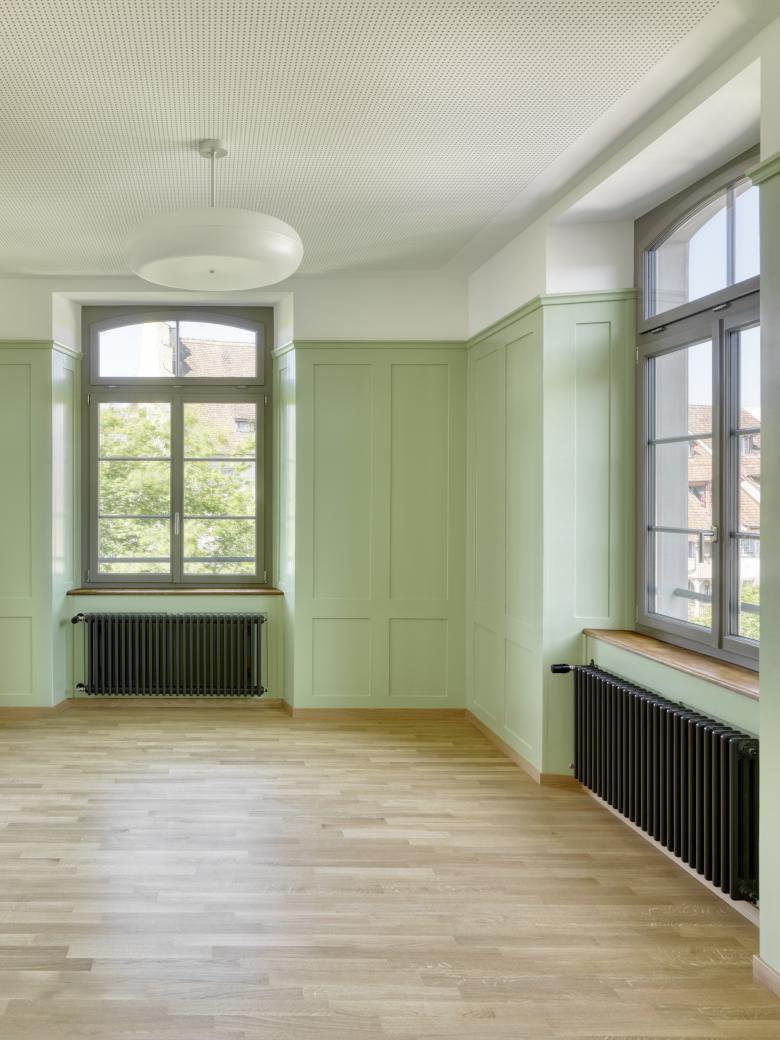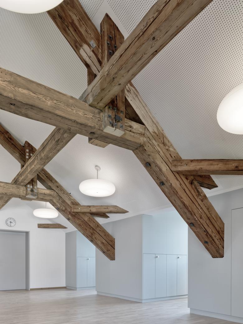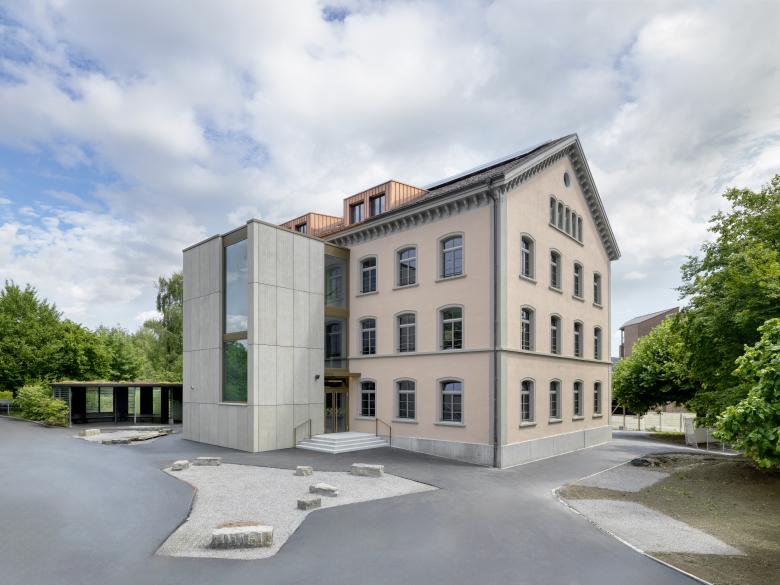 Das Schulhaus Schanz wurde 1853 erstellt und ist im kommunalen Denkmalschutz inventarisiert. Das markante, dreigeschossige, symmetrisch angelegte Gebäude weist eine dreiteilige Fassadengliederung auf, mit Gebäudesockel, einem durch ein Sohlbankgesims abgeschlossenes Hochparterre-Erdgeschoss und den beiden Obergeschossen. Der Übergang von Fassade zum Giebeldach wird durch ein Kranzgesims gesäumt. Regelmässige, einheitlich grosse Fenster mit Rundbogen gliedern die Fassade. Der von aussen sichtbare Eingriff diesbezüglich bildet vor allem der Treppenhausanbau an der Nordfassade mit Zugangstreppe und -rampe. Zusammen mit dem Einbau einer Liftanlage in der Mitte des Gebäudes wird durch diesen eine hindernisfreie Erschliessung aller Geschosse. Neu sind 7 Klassenzimmer mit zugehörigen Gruppenräumen und einem Raum für textiles Gestalten gemäss heutigem Lehrplan untergebracht. Der Anbau wird als reduzierter, einfacher Kubus ausformuliert und setzt sich bezüglich architektonischer Sprache und Materialisierung bewusst ab vom Bestand. Das Volumen bleibt höhenmässig unter der Traufkante des bestehenden Gebäudes, so dass der Dachrand nicht tangiert wird und der Charakter des Altbaus auch von der Nordseite her erhalten bleibt. Das Dachgeschoss wird durch eine neue, brandschutzkonforme Treppe erschlossen. In Absprache mit der Denkmalpflege werden die heutigen Tonnen-Dachgauben durch fünf einheitliche Schleppgauben ersetzt. Im Norddach werden die beiden Lukarnen belassen, aber die Tonnendächer ebenfalls durch Schleppdächer ersetzt. In den Geschossflächen wird unter anderem durch den Einbau der Liftanlage Änderungen im Grundriss notwendig. Durch eine Verschiebung der Innenwände können ausserdem neue Gruppenräume und für den Unterricht grössere Klassenzimmer geschaffen werden.
