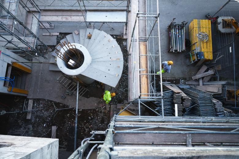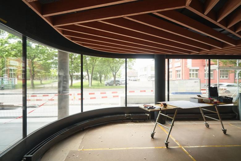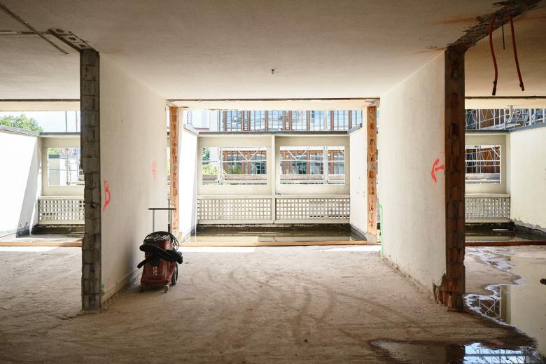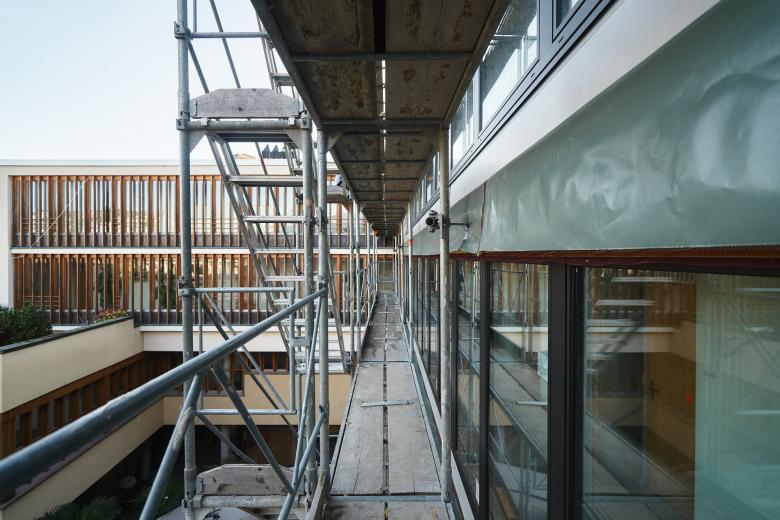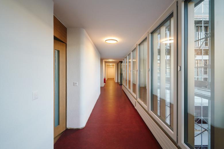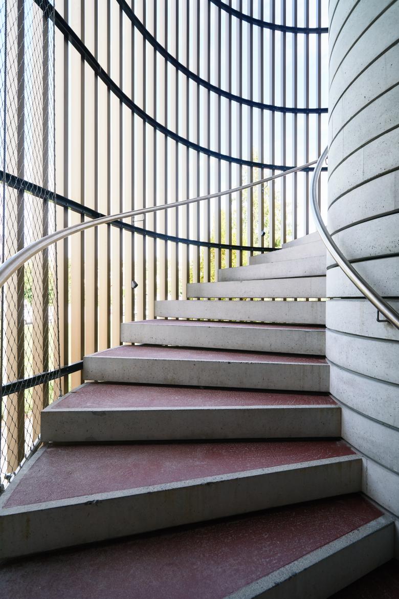 Jedoch bedarf das ganze Gebäude (mit Ausnahme bereits renovierter Wohnungen) einer umfassenden Gesamtsanierung, um alle heutigen Vorschriften und Nutzungsbedürfnisse zu erfüllen. Die daraus notwendigen sichtbarsten Massnahmen sind die neuen Fenster, die neue Gebäudehülle sowie das neue Fluchttreppenhaus. Gemessen an unserem Anspruch, den überdurchschnittlichen architektonischen Charakter des Chappelehofes zu bewahren, sind das massive Eingriffe. Deshalb ist die neue Fassadenkonstruktion so gewählt, dass sie weiterhin verputzt erscheint . Die stilprägenden hölzernen Vertikallamellen werden wiedergebaut, jedoch neu in dauerhaftem bronzenen Alu. Das komplett neue Treppenhaus erhält eine Freiform, um die klaren Formen des bestehenden Gebäudes nicht zukonkurrieren.