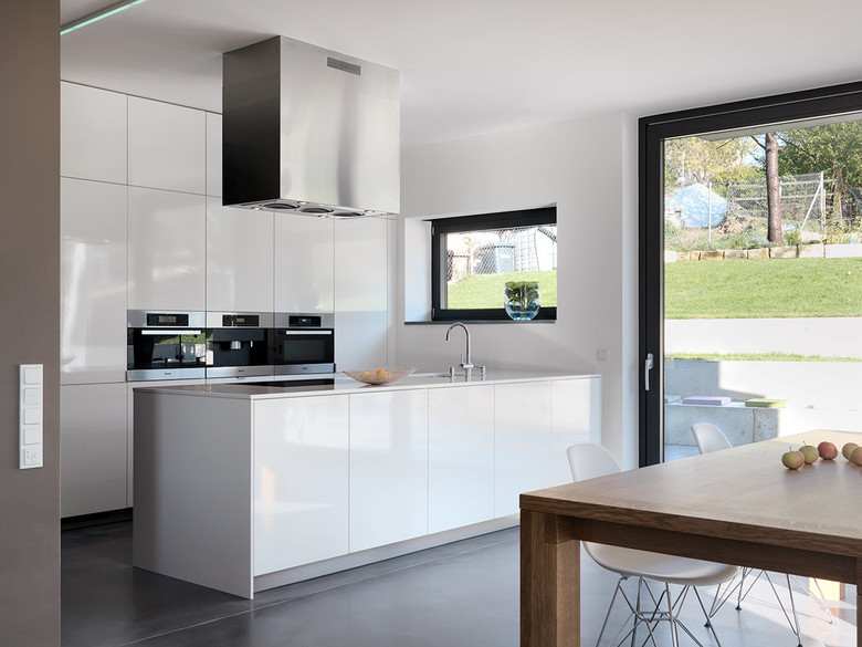 Grundidee für das zentrale Wohngeschoss war es, einen loftartigen Raum zu kreieren, wie ihn die Auftraggeber von ihrer bisherigen Stuttgarter Stadtwohnung gewöhnt waren. Küche, Wohn- und Essbereich sowie eine Bibliothek organisieren sich als offene Einheit um den Treppenhauskern. Die ganz in weiß gehaltene Küche separiert sich lediglich durch den freistehenden Tresen vom Essbereich. Dieser ist das kommunikative und soziale Zentrum der Wohnung – und ein lichtdurchfluteter Ort. Über eine große Fensterfront mit Tür kann man dieses an warmen Tagen zur Terrasse hin erweitern. Tageslicht aus Richtung Süden verbunden mit einer großartigen Aussicht auf den Ort erreicht den Esstisch auch über ein L-förmiges Panoramafenster im sich anschließenden Wohnbereich. Dessen Glasvorbau verleiht der Wohnebene die gewünschte Großzügigkeit und ist zudem ein Platz für Romantiker: Auf einer beheizten Fensterbank aus Sichtbeton kann man stundenlang beim Blick in die Ferne die Seele baumeln lassen. Für Behaglichkeit sorgt außerdem der in einen Wandvorsprung eingelassene Kamin. Der eingestellte, offene Treppenkern verknüpft die drei Ebenen des Hauses miteinander. Seine verschiedenfarbigen Wandflächen stehen im spannungsvollen Kontrast zum sonst im gesamten Haus dominierenden Weiß. Eine besondere Inszenierung erfährt dabei der Weg hinauf in den Privatbereich im Obergeschoss, der vom Tageslichteinfall am Ende der Treppe begleitet wird. Drei langgezogene Lampen-Zylinder verleihen dem Treppenschacht zusätzliche Höhe. Oben angekommen öffnet sich dann unter dem in die Dachfläche abknickenden Fenster ein aussichtsreicher Spiel- und Leseplatz. Die im Obergeschoss untergebrachten Räume – darunter zwei Kinder- sowie das Schlafzimmer – erstrecken sich bis unter das Dach, wodurch sie sehr großzügig wirken.