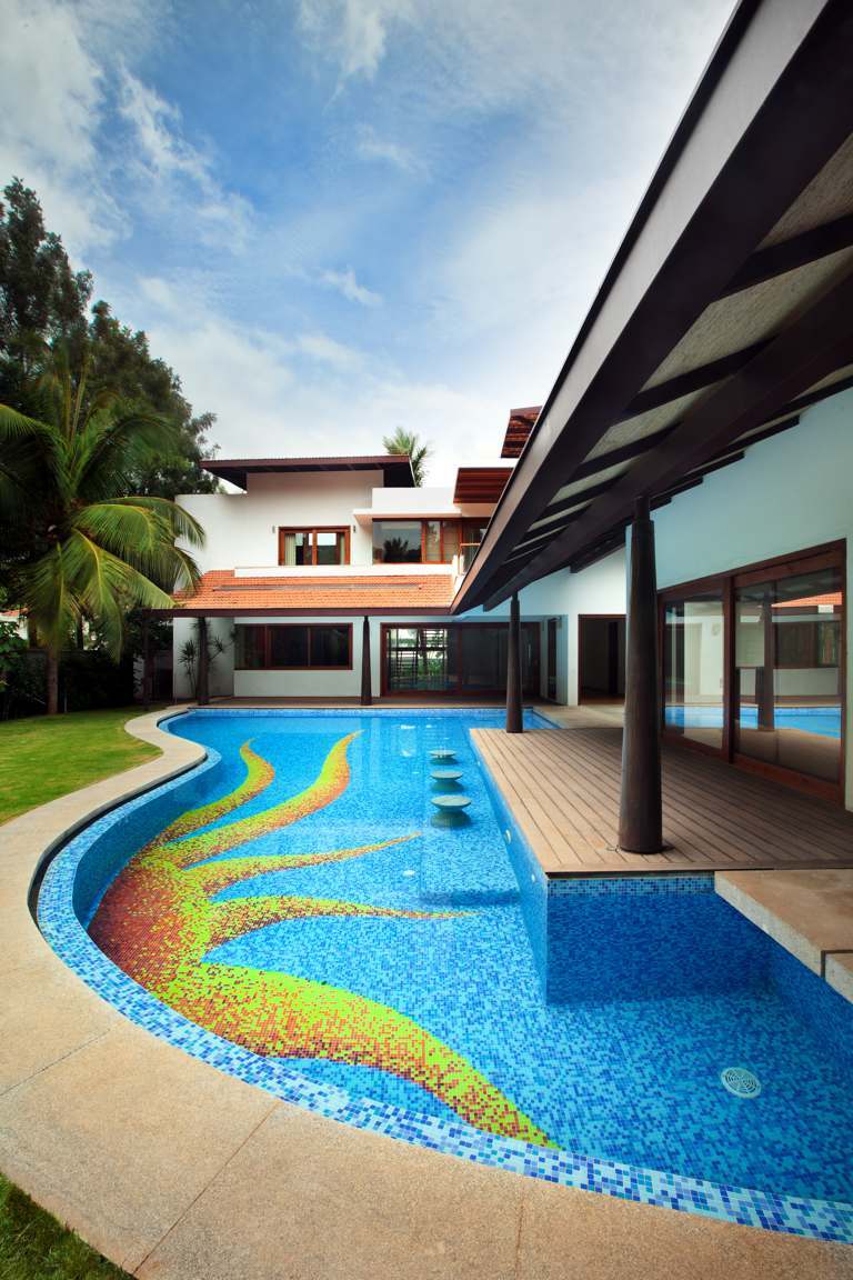 Architects Sandeep Khosla and Amaresh Anand of Khosla Associates chose the built form of the house to orient itself towards a northeastern lung space with the pool and garden being given prominence. The pool was an important aspect of the program with the family of 3 all being avid swimmers. Deep verandahs on the north and eastern sides transition between the living and dining areas to the outdoors.