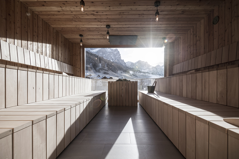 Various lounges and restaurants can be found on the ground floor, always following the alternating natural landscape of the Badia Valley: furniture and sofas in blue, green and brown tones suggest alpine meadows, biotopes, moss forests or rock caves. From the “Base Station” - the reception with gondola – takes you up to the “hut cabins” (rooms & suites), further over the rocks to the summit of snow and ice creating the relaxation area with a view of the Dolomites. The natural experience becomes the main theme of the entire design.