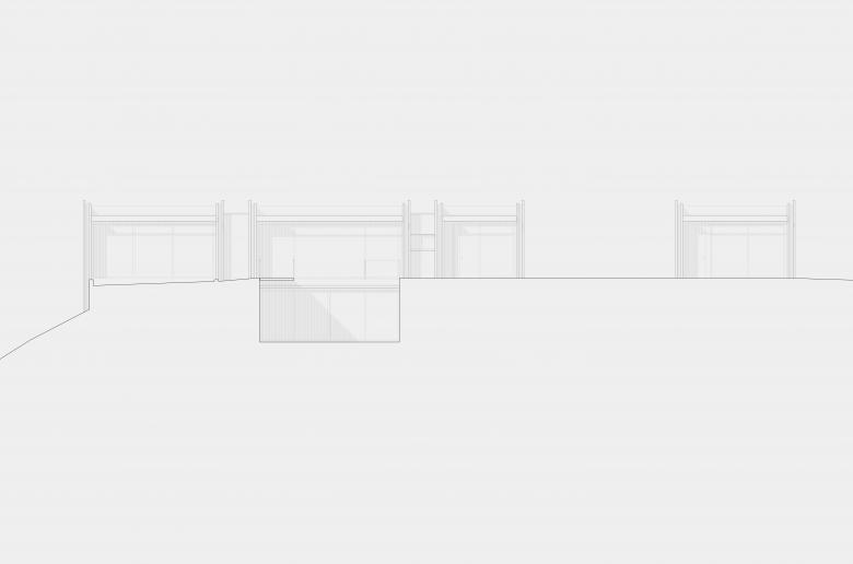 An der Kante eines steilen Hanges mit Blick über Stadt und Landschaft stehen ein Wohnhaus und ein Gästehaus als zwei eigenständige Baukörper. Zur Stadt hin erscheinen sie zweigeschossig, zur Gartenseite als eingeschossige Längskörper. Der Garten mit Schwimmbad, Pergola und dichtem Baumbestand bildet das räumliche Gegenüber zur Architektur. Beide Häuser werden vom Garten aus erschlossen. Ein Zwischenraum trennt Wohnhaus und Gästehaus räumlich, verbindet zugleich den oberen Garten mit dem unteren Hang und gewährleistet die gewünschte Privatsphäre. Die Wohnräume liegen im oberen Geschoss, die privaten Schlafräume im darunterliegenden Erdgeschoss. Ein Glasoberlicht im Gästehaus sowie ein abgesenkter Hof beim Wohnhaus führen Tageslicht tief in die zum Hang orientierten Räume. Der Grundriss folgt einer sequenziellen Ordnung aus Haupt- und Nebenräumen. Die Wohnräume sind seitlich von Sichtbetonwänden gefasst und zur Stadt wie zum Garten vollständig verglast, dienende Räume liegen dazwischen und sind niedriger ausgebildet. Die Tragstruktur folgt dieser Abfolge aus Betonwandscheiben und Decken und erlaubt den Verzicht auf Querwände. So entstehen offene Räume mit fliessenden Übergängen nach aussen, während die seitlichen Einfassungen robust und präzise bleiben. Diese Ambiguität zwischen Festigkeit und Unbestimmtheit prägt die Architektur. Sie entsteht aus der Schichtung tief im Terrain verankerter Sichtbetonwände und darüberliegender, selbsttragender Holzbalken. Innen bleiben die Betonflächen roh, aussen sind die Baukörper mit hinterlüfteten, vertikalen, geschwärzten Holzlamellen verkleidet.