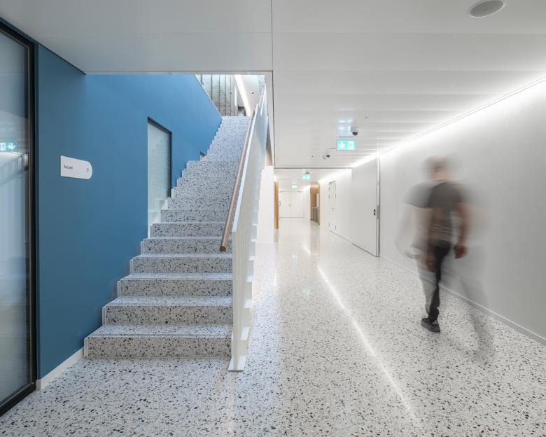Les quatre bandes bâties sont disposées perpendiculairement au siège existant de SICPA, implanté au nord du site. Les 5 étages sont reliés et distribués par des passerelles, alors qu’un axe transversal distribue le rez-de chaussée depuis l’accès principal situé au centre, dans l’axe.