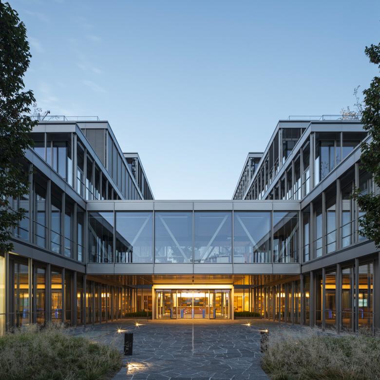 L’enveloppe est constituée de façades rideaux bordées par des coursives protégées par des stores de protection solaire. Ce système, simple et éprouvé, permet d’ouvrir généreusement la vue des espaces de travail sur les espaces végétalisés entre les bâtiments, ainsi que sur le paysage plus lointain.
