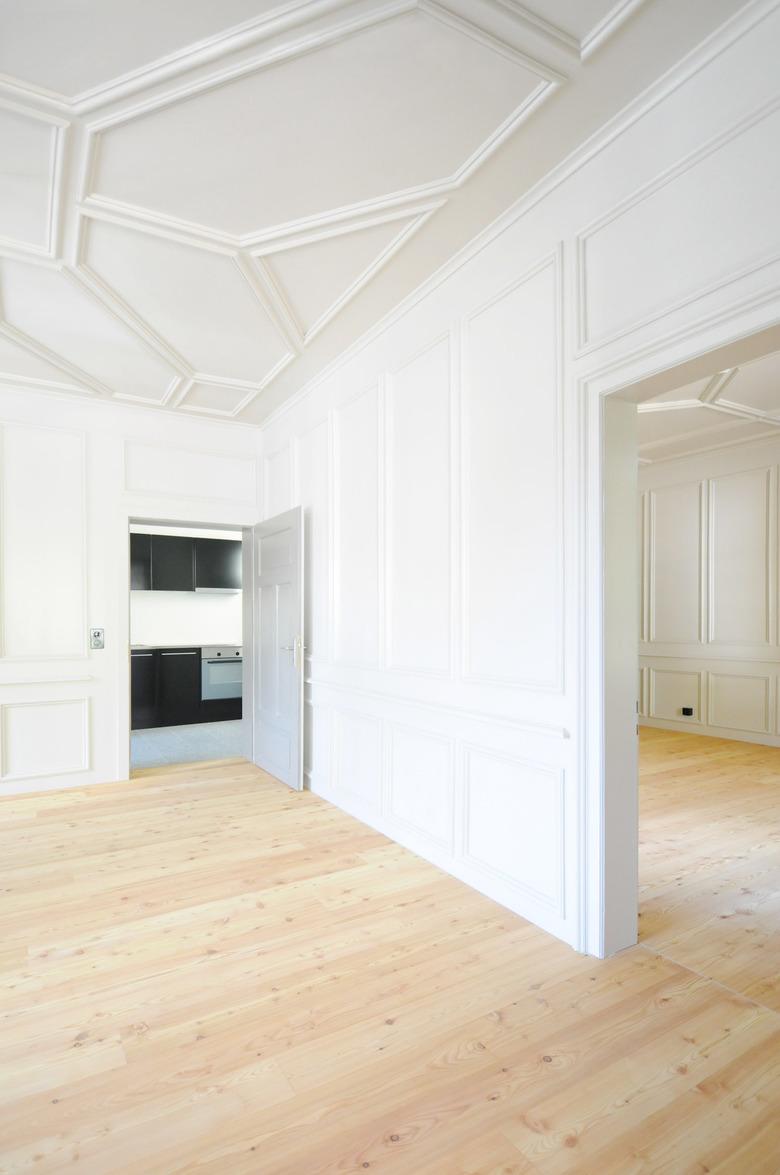 Die als Bauernhaus erbaute Chesa Pravenda beinhaltete den Stall sowie den Wohnteil unter einem Dach. Die Gebäudestruktur, die beiden Keller, der gewölbte Raum im Erdgeschoss sowie die Decke des Stalles (heute Saal) sind original erhalten. 1899 wurde das Haus renoviert und modernisiert. Aus dieser Zeit stammen die Fassade, die Dachkonstruktion, die Veranden, die Holzverkleidung der Stuben und die alten Böden. Im 20. Jahrhundert wurde das Haus in 2 Wohnungen aufgeteilt und eine Garage wurde eingebaut. Die Kirchgemeinde hat uns den Auftrag gegeben, das Haus in eine Altersresidenz mit mehreren Wohnungen umzubauen. Es entstanden 8 kleine Wohnungen für Senioren und eine Grosse im Dachgeschoss für den Abwart. Ziel war es, den Neoklassizistischen Charakter und die Architektur zu erhalten und zu unterstreichen. Die neuen Elemente wurden bewusst als moderne Akzente in der Gestalt von schwarzen Küchen und weissen Bädern mit Steinböden eingesetzt. Einen weiteren Akzent setzt das neue Treppenhaus mit Steinboden und einem Geländer aus gestrichenem MDF. Die Stuben (teils lackiert), die Dachkonstruktion, die Decke des Stalles und die alten Türen im Untergeschoss wurden gereinigt.Die gemalten Stuben und alle anderen hölzernen Elemente im Haus wurden grau gestrichen. In den Wohnungen wurden die alten Holzböden aufgefrischt und wo keine alten Böden waren, wurde ein neues Lärchenholz-Parkett verlegt. Im Untergeschoss entstanden Nebenräume und im ehemaligen Stall wurde ein Saal für die Kirchgemeinde eingebaut. Im gesamten Untergeschoss wurde ein roter Unterlagsboden gegossen und anschliessend geschliffen. Um einen Behindertengerechten Zugang zum Haus zu gewährleisten, wurde ein Eingang im Untergeschoss angelegt sowie ein Lift eingebaut. Äusserlich sind lediglich die neue Eingangstreppe, die Rampe welche zum behindertengerechten Eingang führt, die Lukarnen und die bündigen Fenster der Veranden als neue Elemente sichtbar.