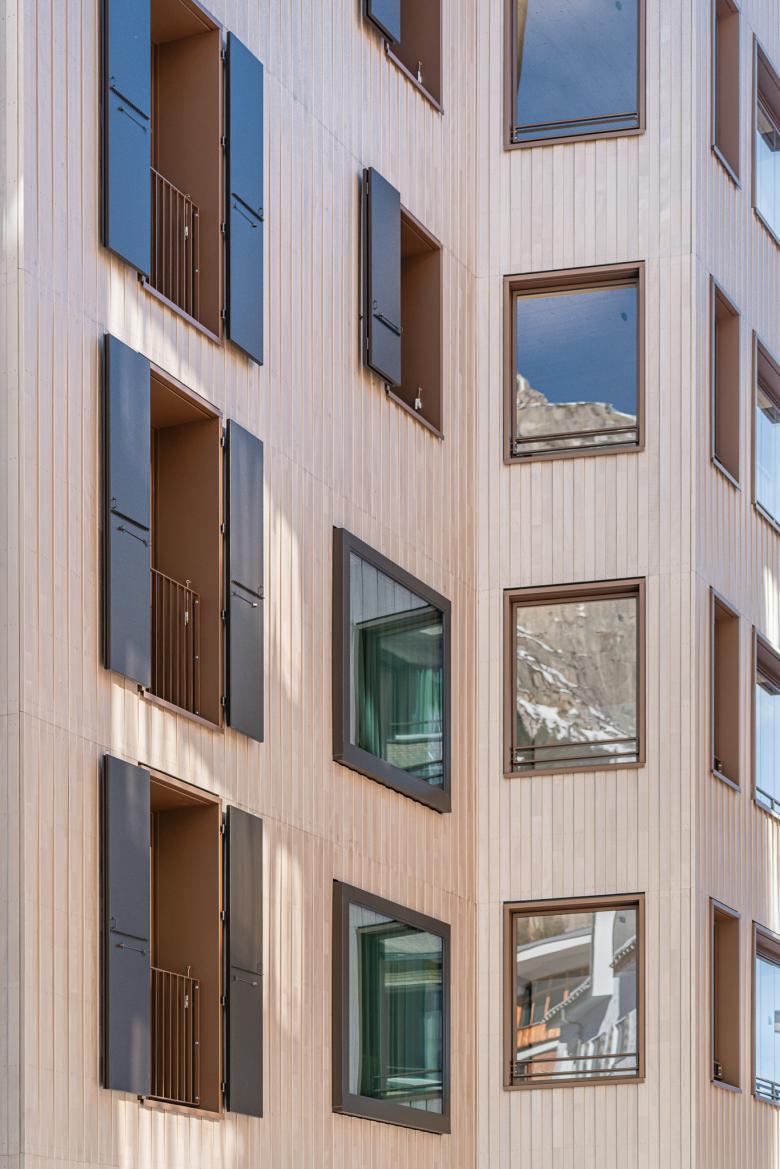 Mit dem Haus Vera interpretiert CAS das traditionelle Chalet neu und verleiht ihm mit der eleganten goldenen Holzfassade einen modernen Twist. Die Holzfassade spielt auf die sanften Formen der Natur an: auf den Wind, das Wasser und die weichen Konturen der schneebedeckten Landschaft. Der Unterschied zwischen Licht und Schatten, zwischen Helligkeit und Dunkelheit ist wichtiger Entwurfsaspekt.