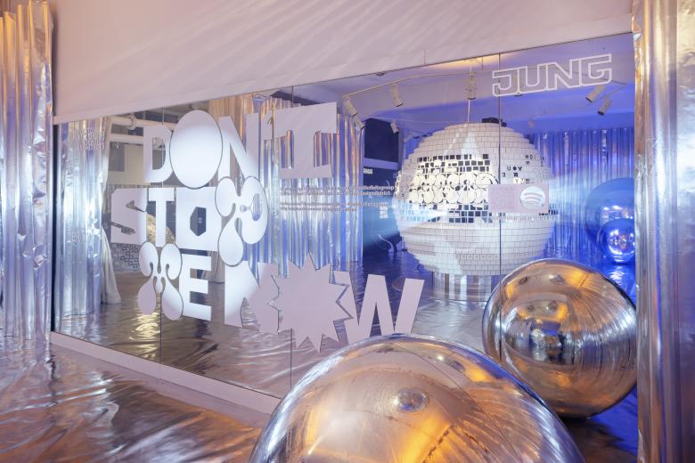 Eine Ballettschule im Hinterhof der Via Palermo 1: Mit einem reflektierenden Banner locken wir die Besucher die Treppe hinunter. Hier wie auch im Hauptraum bedecken lichtreflektierende Vorhänge aus Papier die Wände und leiten die Gäste in einen Raum, dessen Grenzen sich aufzulösen scheinen. Im Zentrum des Raums steht eine Kugel, bestückt mit hunderten JUNG Lichtschaltern. Diese sind bedruckt mit Buchstaben und Grafiken, die sich zu Worten formen. Man muss sich nicht auskennen, um darin Songtexte zu lesen. Dank Ohrwurmpotential spielt im Kopf sofort die Melodie und der Körper wippt im Rhythmus.
