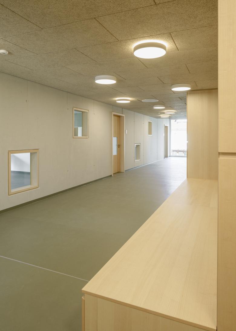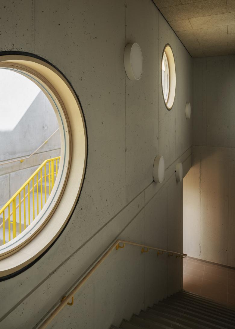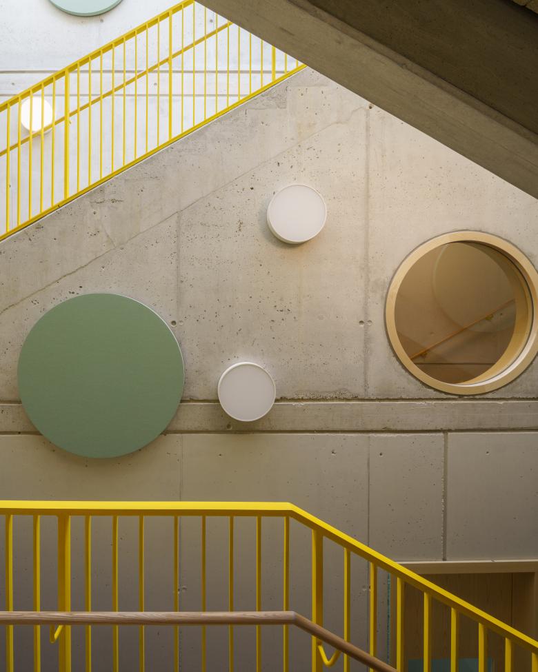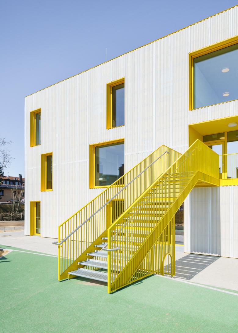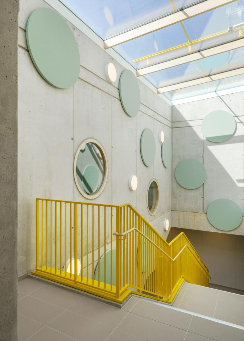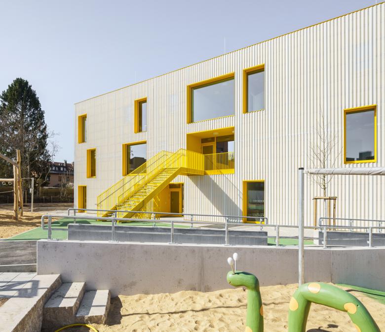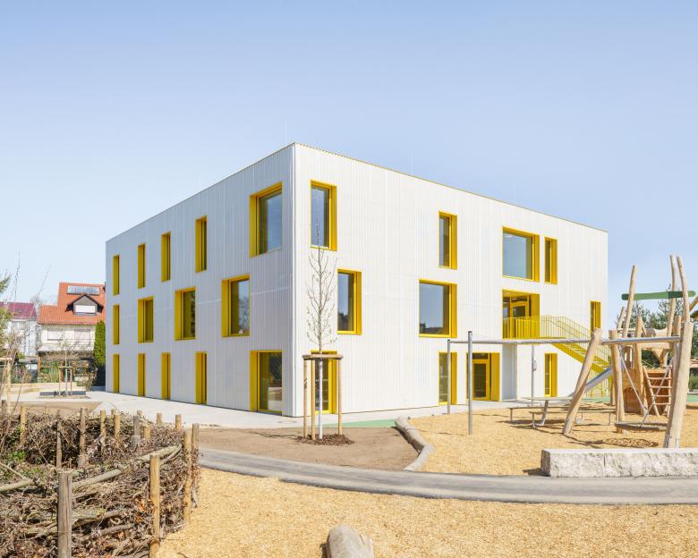 Im Stadtteil Großreuth bei Schweinau entstand ein viergruppiger Kindergarten als Ersatzneubau für 100 Kinder in Kombination mit einer ebenfalls viergruppigen schulvorbereitenden Einrichtung (SVE) für 40 Kinder. Das Gebäude muss als integrative Einrichtung mit Synergieeffekten als unabhängiger Kindergarten sowie als reguläre SVE funktionieren. Unsere Leitidee für den klaren Neubau war, dass beide Nutzungen einen gleichberechtigten Eingang zum gemeinsamen Vorplatz in zweiter Reihe an der Erasmusstraße erhalten. Die erforderlichen zwei unabhängigen Treppen als Erschließung sowie Fluchtweg sind einläufig im Zentrum und überlagernd angeordnet. Über den versetzt offenen Treppenraum mit nur einem Zwischenpodest gelangen die Kindergartenkinder vom Erdgeschoss ins 2. Obergeschoss. Der versetze Luftraum schafft dabei eine klare Orientierung und einen akustischen sowie visuellen Kontakt über das Zwischengeschoss hinweg. Ohne Störung des Kindergartenbetriebs kommen die SVE-Kinder durch ihren eigenen Eingang und die direkte, abgeschlossene Treppe in das 1. Obergeschoss. Alle Gruppenräume orientieren sich zum Freispielbereich und die Konstruktion ermöglicht eine flexible Gestaltung der Nutzflächen um den zentralen Erschließungskern. Außen spiegelt die monochrome, gelbe Hülle mit vielen Öffnungen die funktionalen Anforderungen des kleingliedrigen Innenlebens wieder. Als zweite Gebäudehaut sorgt die weiße, perforierte Wellblecheinkleidung darüber für Struktur sowie Ruhe und ermöglicht bodentiefe Fenster für die Aufenthaltsräume. Diffus scheint die Farbigkeit durch das gelochte Blech. Durch die Transluzenz der Fassade wirkt das Haus je nach Blickwinkel und Tageszeit eher weiß und geschlossen oder farbig und vielschichtig. Nur beim Eingang ist der gelbe Kern direkt spürbar und aus dem SVE-Bereich durchdringt die farbige Treppe das äußere Fassadenkleid und führt die Kinder in den gemeinsamen Garten.