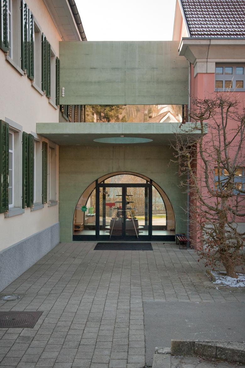 Um die räumlichen Beziehungen erlebbar zu machen, wird das Erdgeschoss weitgehend offen gestaltet. So wird die Ver­bindung zwischen den beiden Schulbauten und der Durch­gang von der Seite des Eingangs zum Garten gewährleistet. Das Obergeschoss wird als Passerelle geschlossener gehalten und gewährt Ausblicke auf die Umgebung. Sämtliche Masse der Möbel sowie die Höhe der Fensteröffnungen sind auf die Grösse der Kinder abgestimmt. Die unkonventionellen Fenster­öffnungen sind eine Anlehnung an die (kindliche) Verspieltheit und an die Gabe, die Welt mit magischen Augen zu sehen. Zudem verleihen die Fenster­öffnungen dem Verbindungstrakt eine formale Eigen­ständigkeit. Er soll als neutraler Vermittler zwischen den unterschiedlichen Zeiten stehen, in welchen der historische Kindergarten und die Erweiterung entstanden sind.
