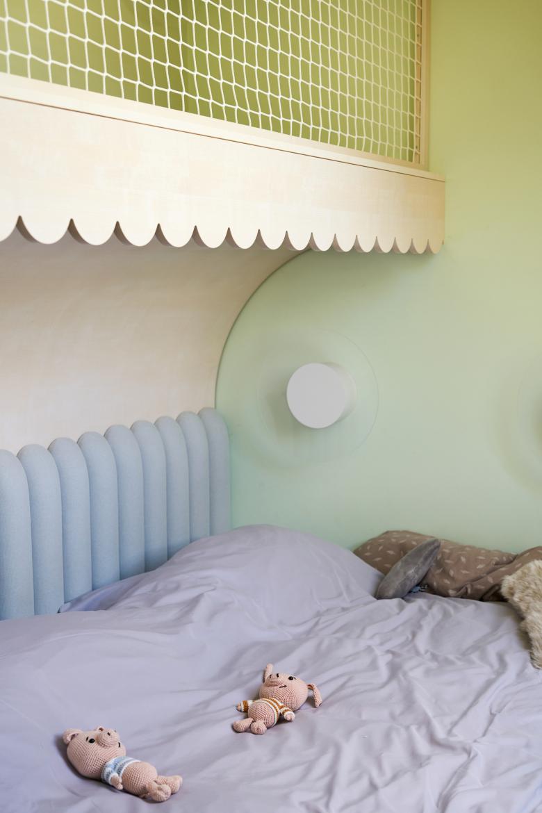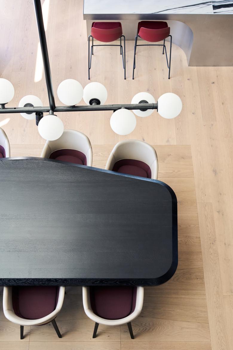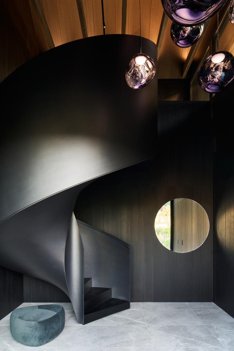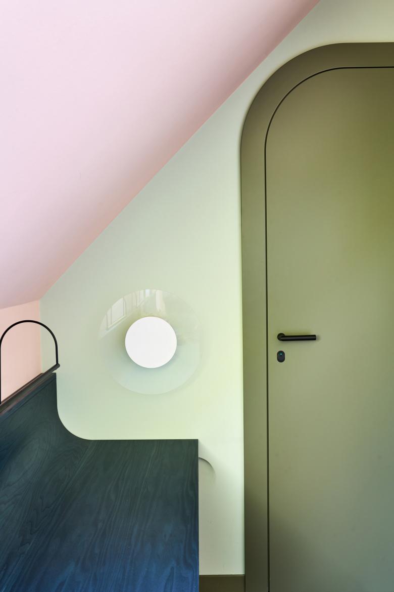 Auch die angenehme Haptik der verwendeten Materialien, die von der umgebenden Natur inspiriert sind, verspricht Verbundenheit: Statt Distanz erzeugen sie Nähe und haben allesamt eine taktile Qualität – sei es die Maserung der Holzoberflächen und -lamellen, die Natürlichkeit der Textilien, die Feinheit des Marmors oder die Tiefe der kleinteiligen Wandfliesen. Jeder Werkstoff verdeutlicht dabei, dass dieses Wohnhaus kein strenger Ort ist, sondern die lebendige Energie der Begegnung in Balance gehalten wird: von Menschen und Charakteren ebenso wie von Materialien und Objekten. Denn ergänzt wird die dezente, warmtonige und sorgfältig aufeinander abgestimmte Gesamtkomposition durch spannungsvolle Akzente: skulpturale Einbauten wie der Küchenblock, ausdrucksstarke Möbel und Leuchten oder persönliche Erinnerungsstücke, die in den offenen Stahlregalen den Wohnraum prägen. So entsteht ein belebter und zugleich behaglicher Heimathafen für die ganze Familie.