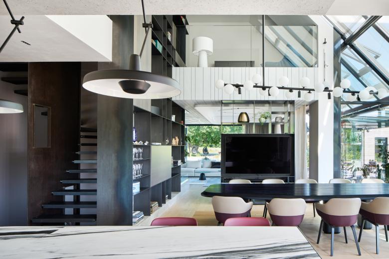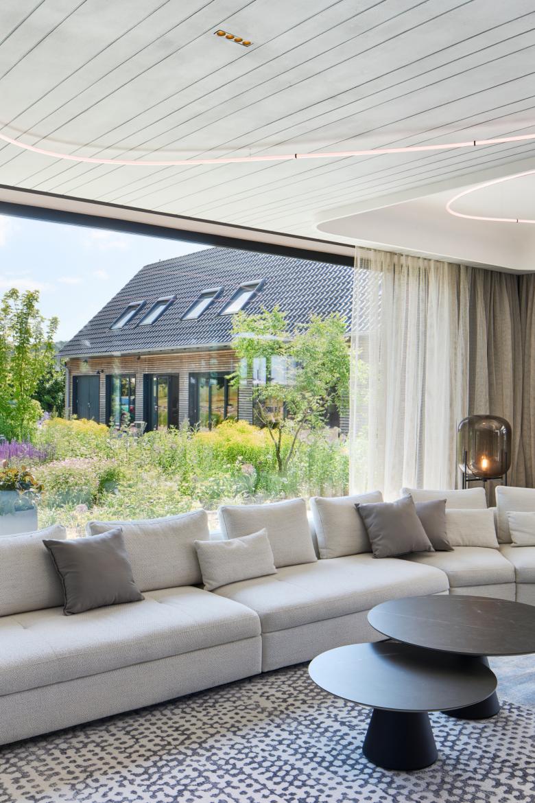 Eingebettet in die idyllische Naturlandschaft Niedersachsens, bietet das umgebaute Wohnhaus mit Langhaus nicht nur viel Raum für Begegnungen, sondern vor allem für erinnerungswürdige Momente. Familienleben wird hier groß geschrieben. Dabei dient das Haupthaus als wesentlicher Treffpunkt der Familie: Mit offener Küche und einem Wohnzimmer, das sich dank öffenbarer Fassade nahtlos in den Wintergarten und damit auch in den Außenraum erweitern lässt, entsteht eine einladende Atmosphäre – wobei der zentrale Essbereich als Knotenpunkt fungiert, an dem sich alles vereint: Nicht nur in der Vertikalen, da der darüberliegende Luftraum die Raumhöhe betont und neue Blickbeziehungen öffnet, sondern auch innerhalb der Fläche, da hier alle zum Essen zusammenkommen. Während sich die Erwachsenen anschließend ins Gespräch vertiefen, kann der Nachwuchs in der Spielecke kreativ werden. Ein kaleidoskopartiges Glasmosaikfenster in Grün- und Blautönen taucht diese Nische in ein besonderes Licht und es entsteht eine eigene kleine Welt für große Pläne. Auch in den oberen Geschossen haben die Enkelkinder mit einem gemeinsamen Raum ihr persönliches Reich, das es zu erobern gilt. Als entspannende Ruheoasen befinden sich hier ebenfalls das Schlafzimmer der Großeltern sowie zwei Suiten für die weitgereisten Gäste.