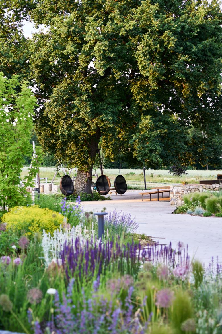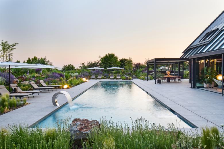 Ist die ganze Familie zusammen, stehen mit den drei Studios im Langhaus weitere Übernachtungsmöglichkeiten zur Verfügung. Das kleinere Gebäude ist dabei vor allem als individueller Rückzugsort gedacht und bietet darüber hinaus Raum für Wellness, Sport, Spiel und konzentriertes Arbeiten. Im Bereich zwischen den beiden Häusern befindet sich nicht nur der Pool, sondern es öffnet sich auch der naturnah gestaltete Garten mit weiteren Gelegenheiten der Zusammenkunft und Räumen, die gemeinsam entdeckt werden wollen – vom Community Table mit Feuerschale über den Birkenhain und einen Nutzgarten mit Hühnerstall bis hin zum Kinderspielplatz mit Trampolin. Auf dem gesamten Grundstück sind Orte entstanden, die das Miteinander fördern und dennoch Freiraum lassen.