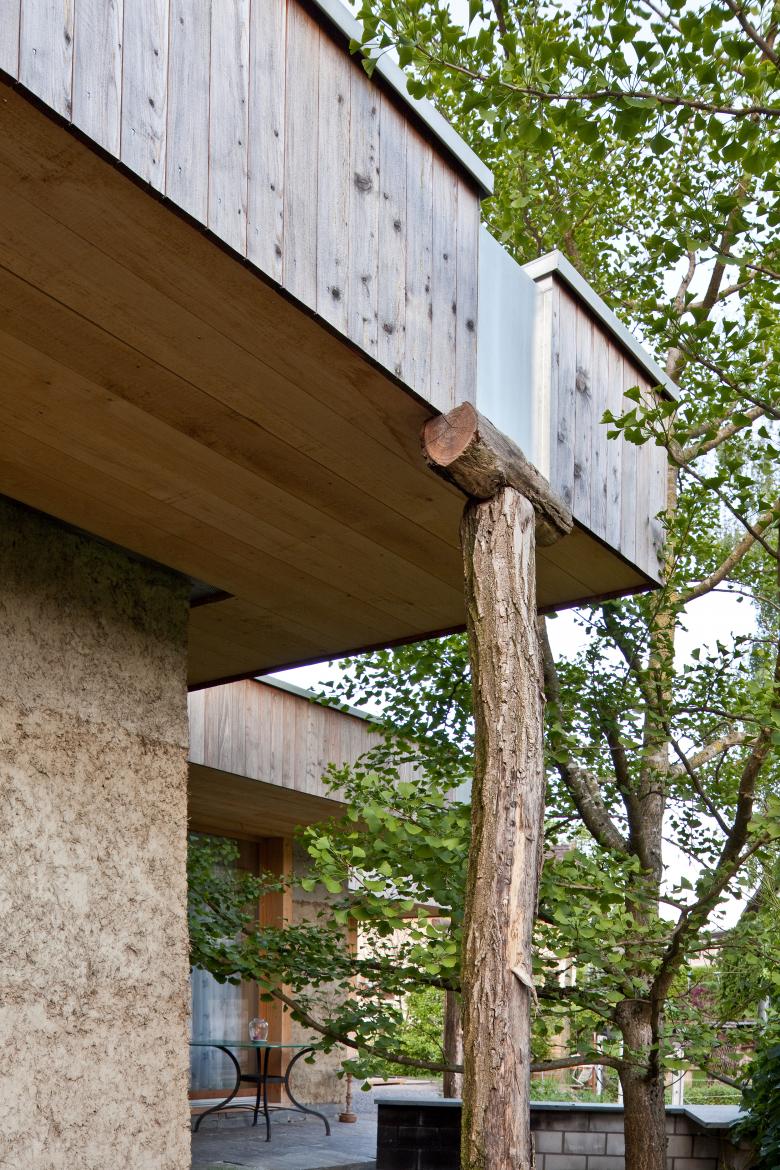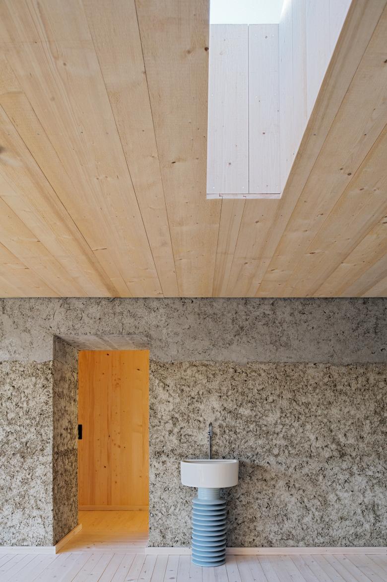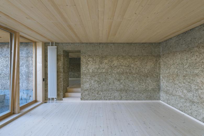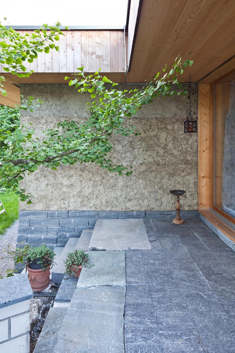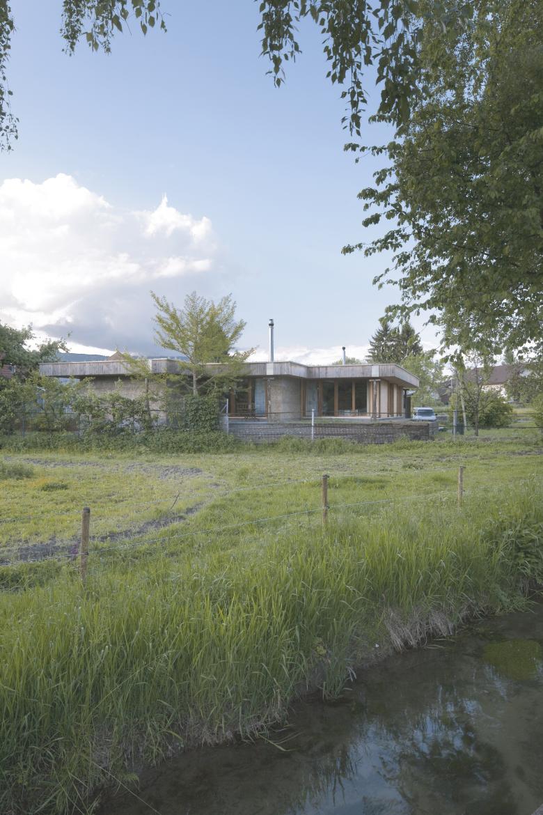 Die unmittelbare Umgebung mit der dörflichen Struktur bildet den Rahmen für den Entwurf. Der Garten, das bestehende Bauernhaus und der Bach geben dem Neubau die Form und formen die Aussenräume. Das pavillonartige Gebäude bildet das Bindeglied zwischen dem Hinterhof und der Gartenoase. Eine prägnante Steinmauer unterteilt diese beiden Aussenräume und verbindet sich mit dem Sockel des Hauses. Das Terrain folgt der Höhenstaffelung des Hauses und erzeugt eine spannungsvolle Topographie. Die Wegführung ist geprägt von einer Vielzahl an Stimmungen, erzeugt durch das Wechselspiel von Kargheit und Lebendigkeit, Enge und Weite, Ein- und Ausblicken. Die Grundrissfigur bildet sich aus zwei L-förmigen Lehmwänden, welche drei Innenräume aufspannen. Diese Räume sind durch schmale Durchgänge verbunden und öffnen sich mit einer grosszügigen Befensterung zum Garten. Der Eingang führt ins Zentrum des Hauses wo sich der Koch- und Essbereich befindet. In der Verlängerung dieses Raumes sind je zwei Terrassen angelegt. Zum Bauernhaus hin öffnet sich das Gartenzimmer. Auf der gegenüberliegenden Hausseite befindet sich zum Bach hin der Rückzugsraum für Ruhe und Erholung. e Verwendung von Ressourcen aus der Nähe verankert das Haus zusätzlich am Ort. Die Kellerwände sind aus Natursteinen erstellt, das Holz stammt aus dem dorfnahen Wald. Die Mauern im Erdgeschoss sind als Wellerlehmwände ausgeführt. Der Lehm stammt aus Baugruben aus der Umgebung. Das Stroh als Dämmmaterial für die Decken ist auf den Feldern Deitingens gewachsen. Die Wärme wird durch einen Holzherd gewonnen. Der Strom stammt von einer Solaranlage. Das Frischwasser fliesst aus einer Quelle. Sogar die Abwässer werden auf Platz entsorgt.