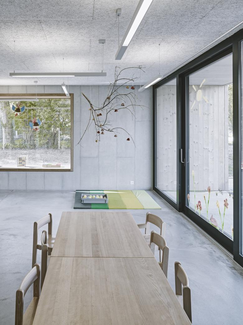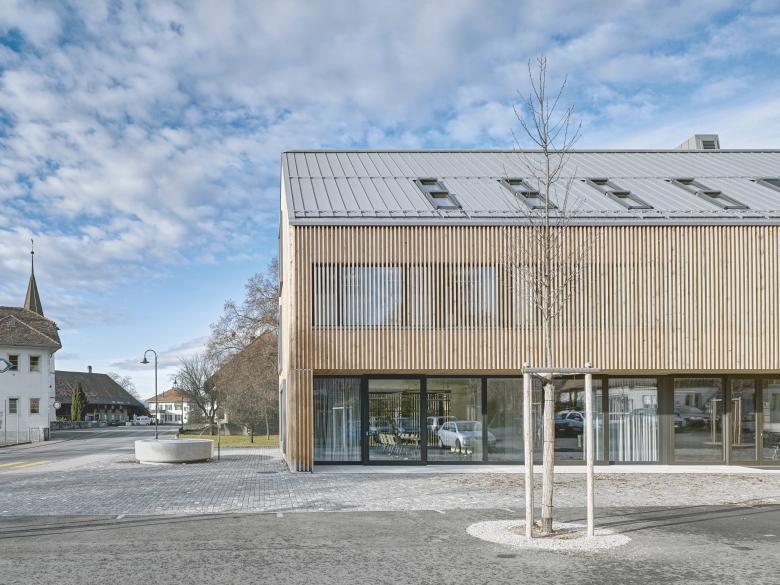 Die Gemeinde Gampelen, eingebettet zwischen Neuenburgersee und Jolimont, hat zur Belebung des Dorfzentrums in Nachbarschaft zur Kirche, Gemeindeverwaltung und Schule ein neues Gebäude mit Mehrzwecksaal, Kindertagesstätte und Ärztezentrum errichtet. Gleichzeitig wurde die Umgebung des ganzen Perimeters im Dorfzentrum als öffentlicher Aussenraum gestaltet. Dieser ermöglicht verschiedenste Nutzungen wie Feste und Märkte. Das neue Gebäude passt sich sowohl in Grösse als auch in Form in den durch grosse Einzelbauten geprägten Ortskern ein. Das Gebäude ist als klares, länglich ausgerichtetes Volumen konzipiert, das alle Funktionen unter einem Dach zusammenfasst. Mit einem über die gesamte Länge der Ostfassade reichenden, gedeckten Aussenbereich orientiert sich das Gebäude zum neuen Dorfplatz. Dieser Raum greift das Thema der grossen Vordächer der alten Bauernhäuser in der Umgebung auf, ist gedeckte Aufenthaltszone und markiert die Zugangsfassade. Der Mehrzwecksaal und die Kindertagesstätte sind direkt von der Eingangshalle aus über grosszügige Eingänge erschlossen. Diese beiden stützenfreien Räume orientieren sich mit raumhohen, öffenbaren Fenstern in der westlichen und östlichen Fassade gegen den Platz und gegen den Garten. So ist eine Nutzung des Saals im Zusammenhang mit Veranstaltungen im Freien möglich. Die Kinder der Tagesstätte profitieren von einem direkten Zugang zum Garten. Diese Räume können leicht auch für andere als die zurzeit geplanten Nutzungen angepasst werden. Im Ober- und Dachgeschoss ist das Ärztezentrum angeordnet. Der Grundriss ist gekennzeichnet von einer Serie von gleichgrossen Raumzellen, die entlang der Ost- und Westfassaden angeordnet sind.