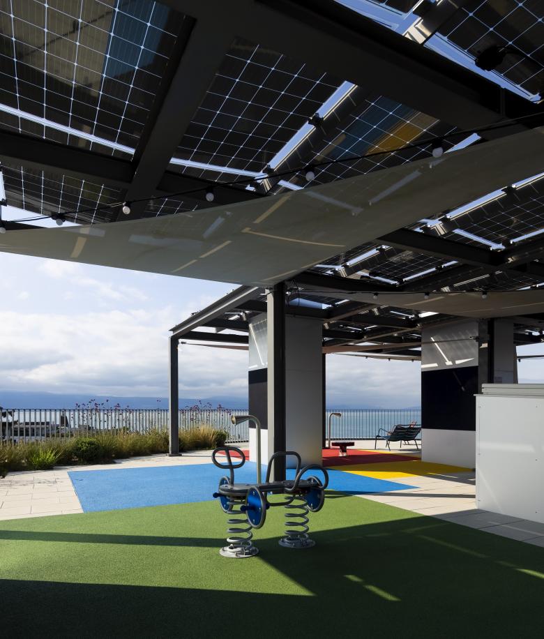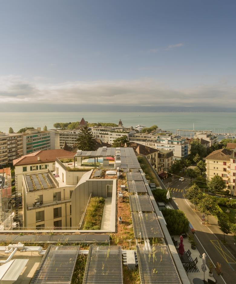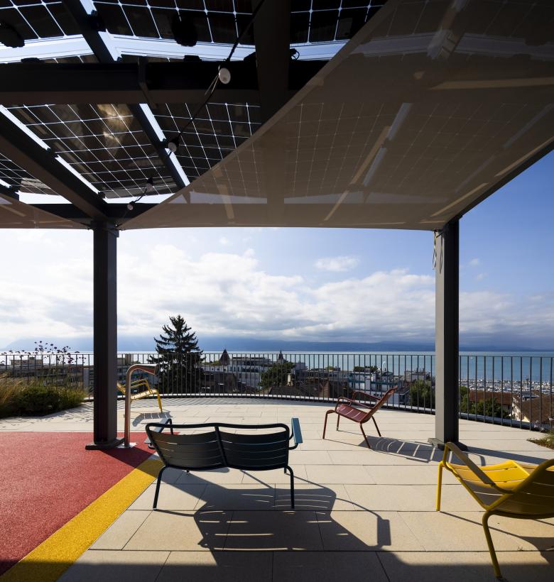 La toiture terrasse est aménagée en espace de rencontre et de loisirs pour les habitants de l’immeuble, grâce au financement du pourcent culturel de la SCHL baptisé « Plus SCHL ». Il comprend un jardin commun offrant une vue imprenable sur le lac, des jeux pour enfants, ainsi qu’une salle de 30m2 pouvant être louée par les locataires de l’immeuble.