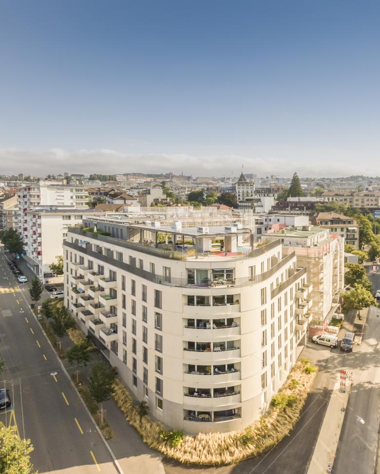 Situé au bas de l’Avenue de la Harpe, à deux pas du port d’Ouchy à Lausanne, le bâtiment prend la place d’un immeuble de 1933 ne répondant plus aux attentes contemporaines en termes d’habitabilité et de confort.