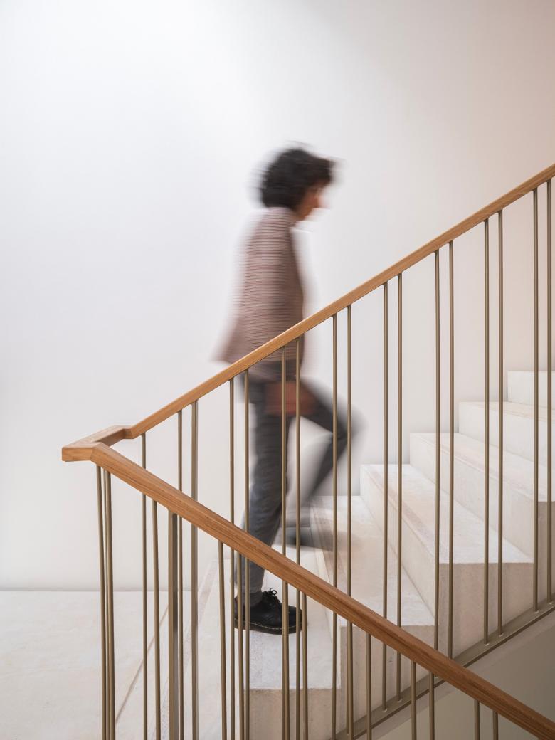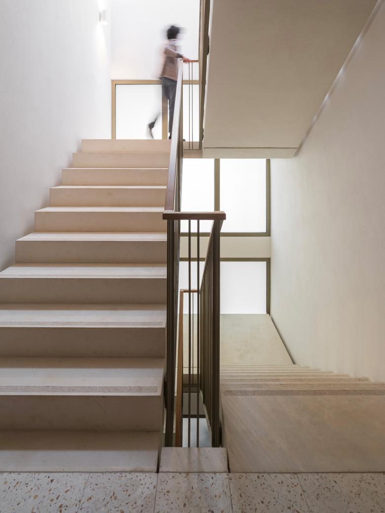 L'accès aux logements sur la face nord au niveau du 1er étage, permet à l'église d'avoir un flux totalement indépendant par son accès du côté sud au rez-de-chaussée. Les cages d'escalier aux finitions épurées et de qualité — sol en terrazzo, escaliers en béton préfabriquées clair et portes en chêne — bénéficient de la lumière naturelle reflétée à travers une baie vitrée de la loggia.