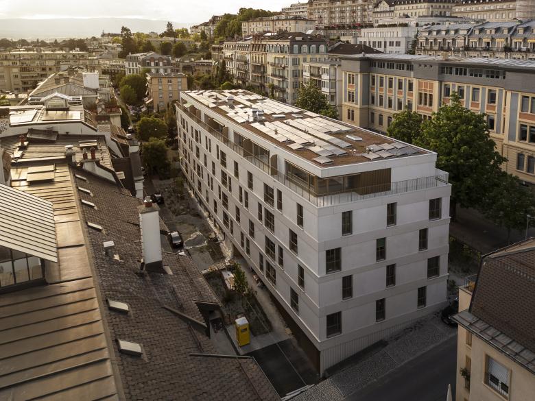 Situé au cœur de Lausanne, dans un quartier dense et historiquement riche, le nouvel immeuble de logement abrite 40 appartements de 2,5 à 4,5 pièces ainsi que les locaux de la Première Église du Christ, Scientiste, l’ancien propriétaire du site. Dans un contexte offrant peu de dégagements visuels au sud et un apport en lumière naturelle mesuré, un des principaux défis de la démarche consiste à mettre à disposition des habitants des espaces de vie attrayants et de qualité. L’immeuble adopte un langage architectural sobre et raffiné, intégré aux ensembles historiques voisins et respectant la mémoire de l'ancienne église présente sur ce site.
