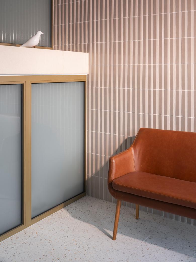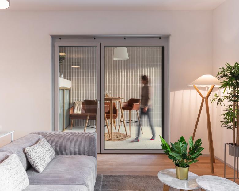 Dans les espaces de vie, le revêtement de sol en terrazzo se mêle au parquet en chêne et aux menuiseries laquées avec une teinte gris clair. Une attention particulière est portée à la finition des meubles encastrés et aux équipements des salles de bain. Des carrelages de faïence aux teintes sablées recouvrent les entrées de l'immeuble ainsi que les parois des loggias, reflétant la lumière extérieure dans le salon, tout en animant les façades.