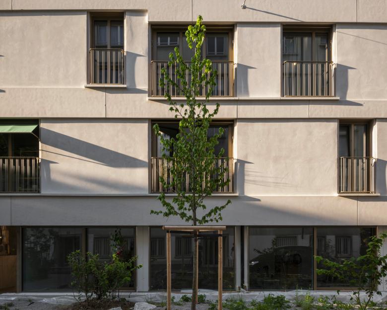 Dans le développement du projet, la proximité avec les immeubles d'en face conduit à exploiter le fort potentiel de la façade nord qui donne sur une grande et lumineuse cour intérieure d'un bâtiment historique, bordée par de vieux châtaigniers.