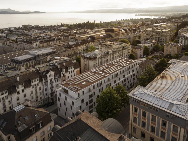 Les appartements en attique bénéficient d’une orientation sud et une vue panoramique sur le lac. Le bâtiment est équipé d’une toiture végétalisée, permettant la rétention des eaux de pluie ainsi qu’un meilleur confort thermique des appartements au dernier étage. Une installation de panneaux photovoltaïques sur le toit alimente le système de chauffage par des pompes à chaleur air-eau. Le renouvèlement d’air dans les appartements se base sur un concept « low tech » très efficient et à faible consommation électrique, soit une ventilation simple-flux.
