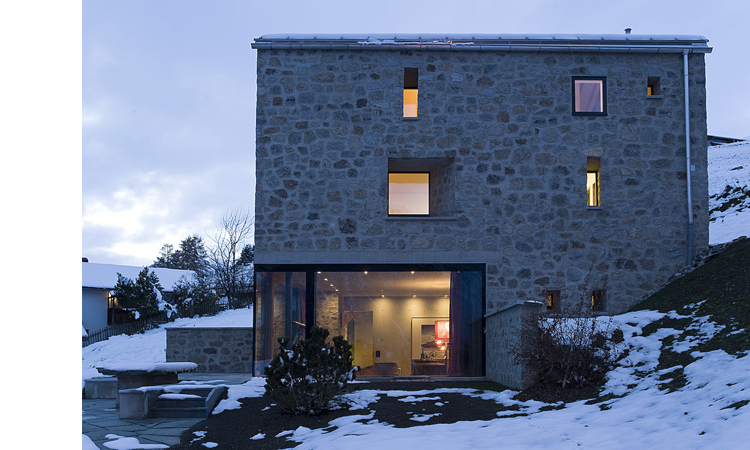 Sent ist ein kleines Bergdorf oberhalb von Scuol im Unterengadin. Das freistehende dreistöckige Einfamilienhaus steht am Dorfrand an einem steilen Wiesenweg, kurz vor dem Waldrand. Das Haus ist ein mit Bruchsteinen verkleideter Würfel aus massivem Mauerwerk. Die Bruchsteine aus einem Engadiner Steinbruch zeigen die Verwurzelung mit dem Ort auf: Ein Haus wie ein Stein als Teil der Natur.