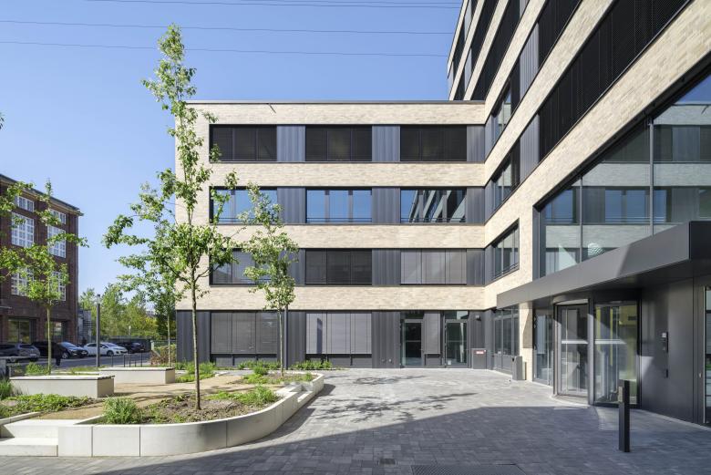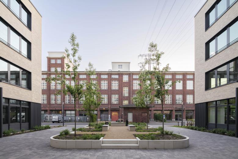 Zwischen den freistehenden Gebäudeteilen öffnen sich begrünte Innenhöfe. Alle Dächer sind als extensive Gründächer vorgesehen. Im Bereich der Staffelgeschosse sind zudem Dachterrassen als aufgeständerte Konstruktion angebracht, die jedoch gegenüber der Nutzungseinheit nicht stufenlos zugänglich sind. Insgesamt ergibt sich aus den zwei Gebäuden eine Brutto-Grundfläche von ca. 50.000 m².