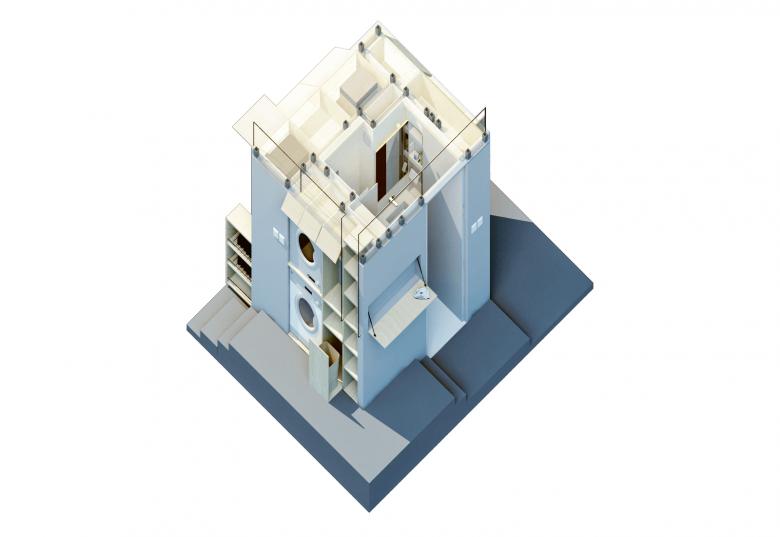 For this project, the architects developed a sanitary block that combines a kitchen, bathroom, and toilet with storage space. The block can also be deployed independently in other courtyard houses and offers a solution for the residents’ most pressing problems, who must still use public toilets in the alley and whose kitchens are often accommodated in very improvised external structures in the courtyard.