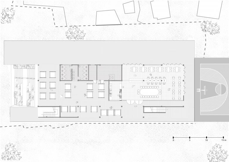 The study space on the ground floor is surrounded by full-length glass panels, which can be opened or closed based on the functional requirements of activities. When opened, the entire study space can extend outdoors, providing a seamless connection between the indoor and outdoor areas.And to a certain extent, leaving some flexibility can meet the needs of different forms of activities (such as markets and performances).