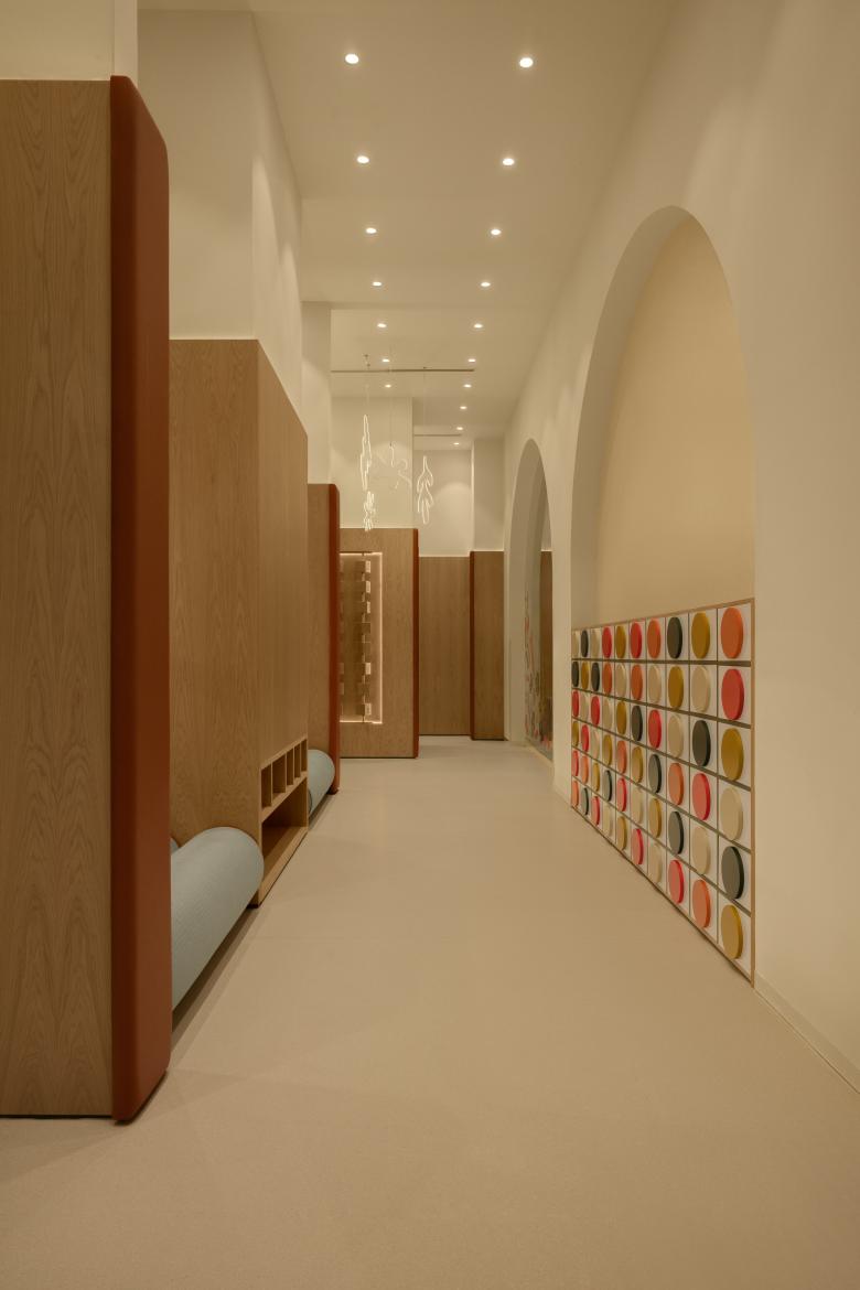 Execution required a high level of precision. Curved joinery and custom-built play structures were prototyped and tested prior to installation to ensure safety, durability, and finish quality. Impact-absorbing flooring, non-slip surfaces, and rounded edges are carefully integrated to meet international safety and hygiene standards while maintaining visual coherence.