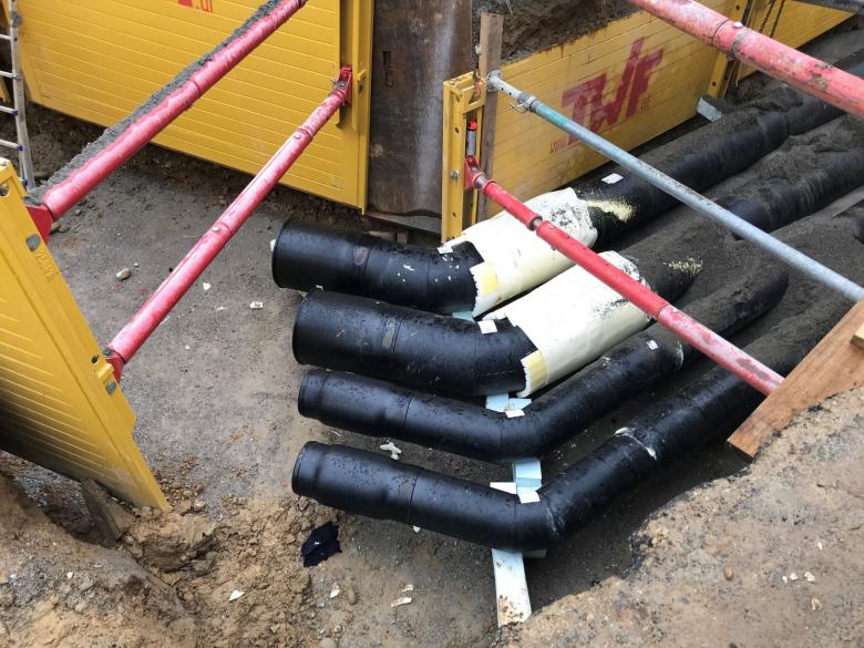 Der gespriesste Grabenbau für das Fernwärmetrasse bestehend aus 8 Rohren mit Aussendruchmesser zwischen 25-45cm welches zweilagig verlegt wird erstreckt sich auf eine Länge von zirka 160m. Dazu wird noch ein Hausanschluss für das bestehende Gebäude Wäscherei erstellt. Teilweise waren die Gräben in rund 3.5m tief. Bestehende Leitungen und unterirdische Kanäle mussten mit der zu wählenden Linienführung berücksichtigt werden.