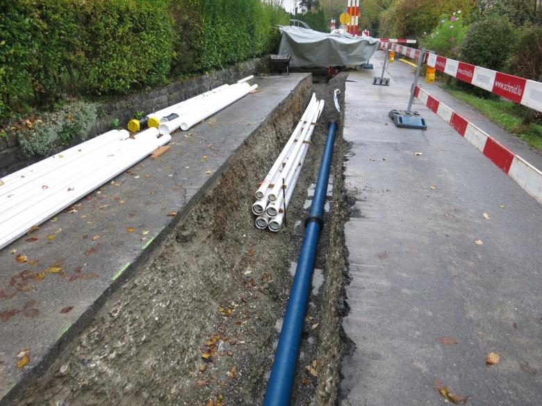 Gleichzeitig mit der Sanierung Wasserleitung erfolgten auch 230 Meter neuen Elektrorohrblock inklusive vier Elektroschächten, sowie die Erschliessung der UPC bis zur Grundstücksgrenze durch Kabelschutzrohre und Schächte.