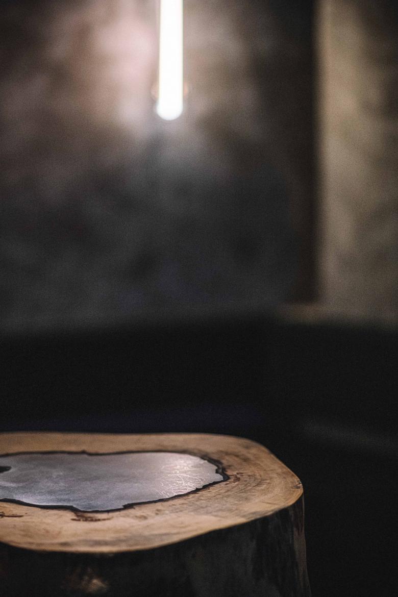 Adhering to PENICILLIN’s philosophy of closed-loop creation process and utilizing locally found resources, COLLECTIVE invited and collaborated with @streetsignhk, a local conservation group that advocates street signs as urban cultural heritage, to co-design and fabricate customised neon wall lights, signages and handmade labels for the bespoke cocktail bottles. COLLECTIVE also worked with HK Timberbank, a local social entrepreneur focusing on recycling and reusing timber for construction and carpentry, to source pieces of fallen tree trunks from the typhoon seasons and fabricated the tabletops.