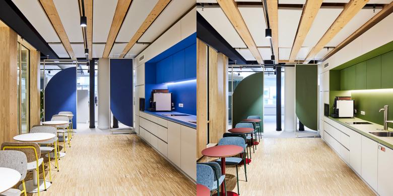 Die Umgestaltung des markanten Bürobaus aus den 1990er-Jahren verfolgt das Ziel, ihn den heutigen Anforderungen an moderne Arbeitswelten anzupassen und ein flexibles, zukunftsfähiges Raumkonzept für das Unternehmen zu schaffen. In dem von Oliv Architekten revitalisierten Bestandsgebäude wird durch eine gezielte Neustrukturierung der Büroflächen mit einem innovativen Desk-Sharing-Konzept nicht nur eine effiziente Flächennutzung erreicht, sondern auch eine inspirierende und produktivitätsfördernde Arbeitsatmosphäre geschaffen. Klare Zonierungen mit Home-Zones für die Teams, vielfältige Rückzugsorte sowie ein durchdachtes Gestaltungskonzept, das sich an der Corporate Identity des Unternehmens orientiert, sorgen für ein harmonisches Gleichgewicht zwischen Offenheit, Kommunikation und konzentriertem Arbeiten. Ein intensives Change-Management mit Workshops und der direkten Einbindung der Mitarbeitenden stellt sicher, dass die Transformation nicht nur architektonisch, sondern auch funktional und kulturell erfolgreich umgesetzt wird. Ergänzend dazu stärkt die Einbettung in ein urbanes Umfeld mit zusätzlichen Nutzungen wie einer Kindertagesstätte, einem Konferenzzentrum und einer begrünten Campusstruktur die Synergien zwischen Arbeiten, Leben und sozialer Interaktion im Quartier.
