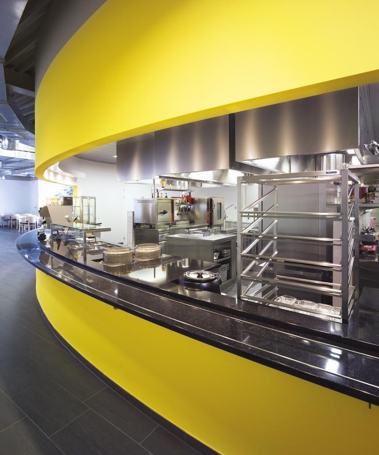 Auf dem Gelände des Produktionsgebäudes der Kaba AG in Wetzikon befand sich ein Personalrestaurant, das baulich, betrieblich und hygienisch nicht mehr den aktuellen Bedürfnissen entsprach. Es musste ein Ersatzbau entworfen werden sowie zusätzliche Schulungsräume, die unabhängig von der Produktion benutzt werden können. Durch die Aufstockung des Produktionsgebäudes direkt auf die bestehende Konstruktion wurde der existierenden Anlage die dringend benötigte, neue Identität gegeben. Es entstand ein architektonisches Merkmal, dessen Zentrum die ellipsenförmige Grossküche bildet. Die räumlich klare Gliederung und Grundrissorganisation ermöglichen im Innern eine grosse Nutzungsvielfalt, die mit der markanten Erschliessung sowohl intern als auch extern benützt werden kann. Das bestehende Stützenraster des Produktionsgebäudes wurde übernommen. Der Erschliessungskern und Teile der Aussenwände wurden in Massivbauweise betoniert, die Leichtbauwände können flexibel positioniert werden. Das Dach wurde als Stahlkonstruktion ausgebildet und mit vorfabrizierten Betonplatten eingedeckt.