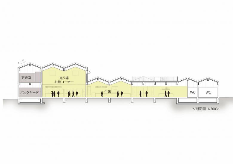 敷地後背地の塩土集落の漁師小屋・母屋群がつくる文化的景観に、屋根勾配やスケールを合わせつつ、サンプリングした色から商業施設としての明度設定を行うことで、新しい景観をつくりながら今ある文化的景観の価値を高め、地元の方が誇りに思えることを意図した。