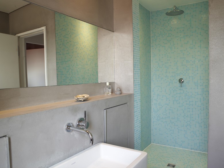 Licht und Schatten entstehen durch eine Vielzahl an Kanten und Wandvorsprüngen. Der raue Putz unterstreicht die Konturen und gibt dem Raum Tiefe. Gegenüber angeordnete Spiegelbänder lassen diese Konturen um den Raum tanzen und das kleine Bad großzügig erscheinen. In den notwendigen Vormauerungen wurden dezent Stauräume integriert. Aufgebrochen wird diese graue, raue, erdige Stimmung durch das leuchtende Türkis der Glasfliesen der offenen Dusche.