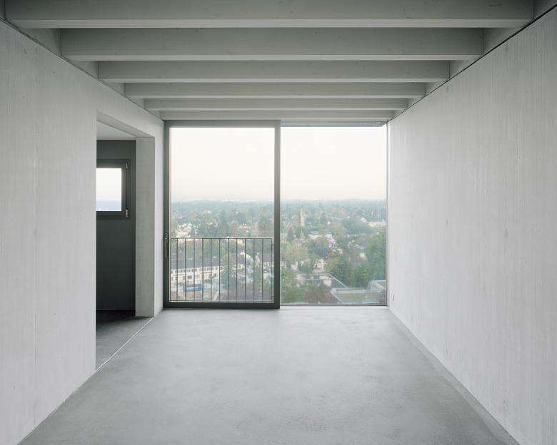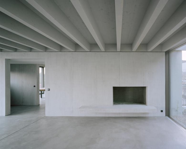 An der Kante eines steilen Hanges mit Blick über Stadt und Landschaft stehen ein Wohnhaus und ein Gästehaus als zwei eigenständige Baukörper. Zur Stadt hin erscheinen sie zweigeschossig, zur Gartenseite als eingeschossige Längskörper. Der Garten mit Schwimmbad, Pergola und dichtem Baumbestand bildet das räumliche Gegenüber zur Architektur. Beide Häuser werden vom Garten aus erschlossen. Ein Zwischenraum trennt Wohnhaus und Gästehaus räumlich, verbindet zugleich den oberen Garten mit dem unteren Hang und gewährleistet die gewünschte Privatsphäre. Die Wohnräume liegen im oberen Geschoss, die privaten Schlafräume im darunterliegenden Erdgeschoss. Ein Glasoberlicht im Gästehaus sowie ein abgesenkter Hof beim Wohnhaus führen Tageslicht tief in die zum Hang orientierten Räume. Der Grundriss folgt einer sequenziellen Ordnung aus Haupt- und Nebenräumen. Die Wohnräume sind seitlich von Sichtbetonwänden gefasst und zur Stadt wie zum Garten vollständig verglast, dienende Räume liegen dazwischen und sind niedriger ausgebildet. Die Tragstruktur folgt dieser Abfolge aus Betonwandscheiben und Decken und erlaubt den Verzicht auf Querwände. So entstehen offene Räume mit fliessenden Übergängen nach aussen, während die seitlichen Einfassungen robust und präzise bleiben. Diese Ambiguität zwischen Festigkeit und Unbestimmtheit prägt die Architektur. Sie entsteht aus der Schichtung tief im Terrain verankerter Sichtbetonwände und darüberliegender, selbsttragender Holzbalken. Innen bleiben die Betonflächen roh, aussen sind die Baukörper mit hinterlüfteten, vertikalen, geschwärzten Holzlamellen verkleidet.