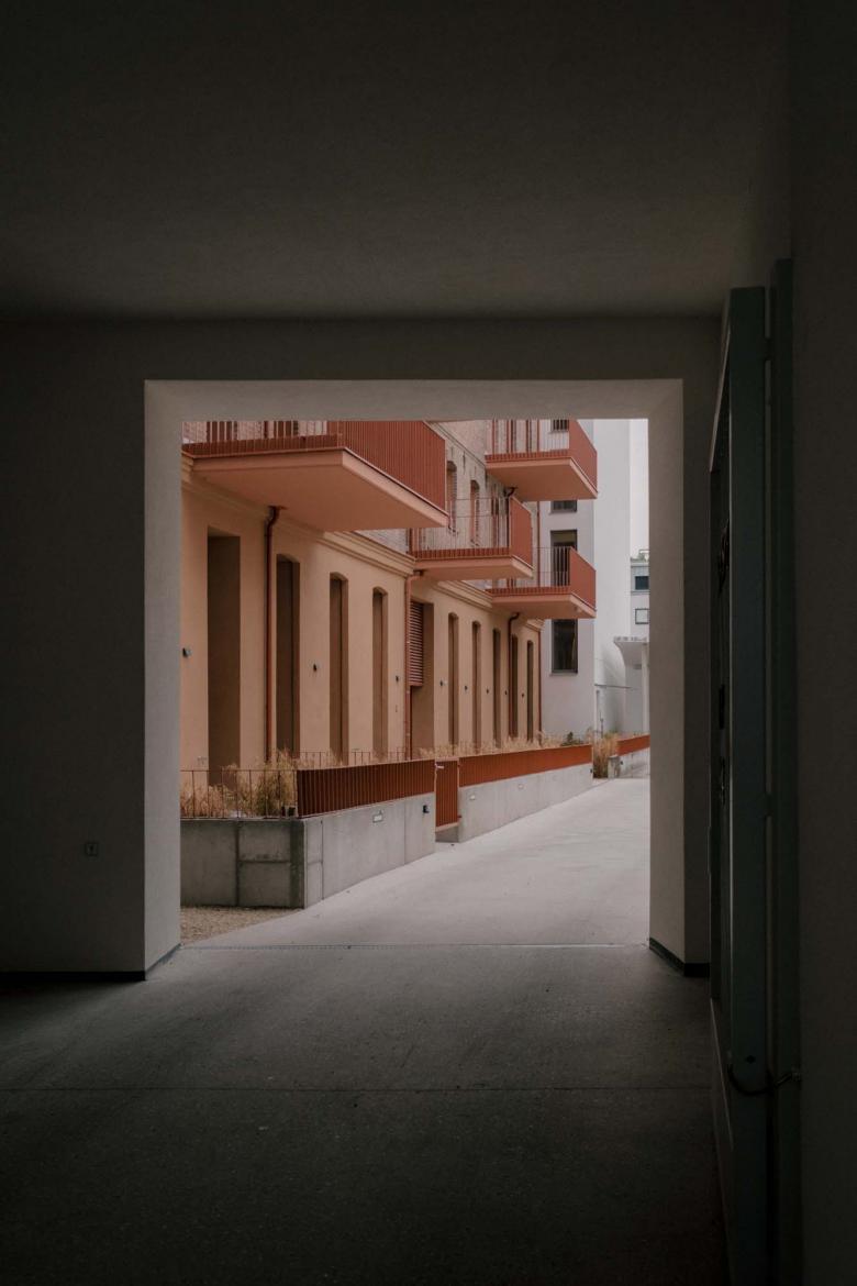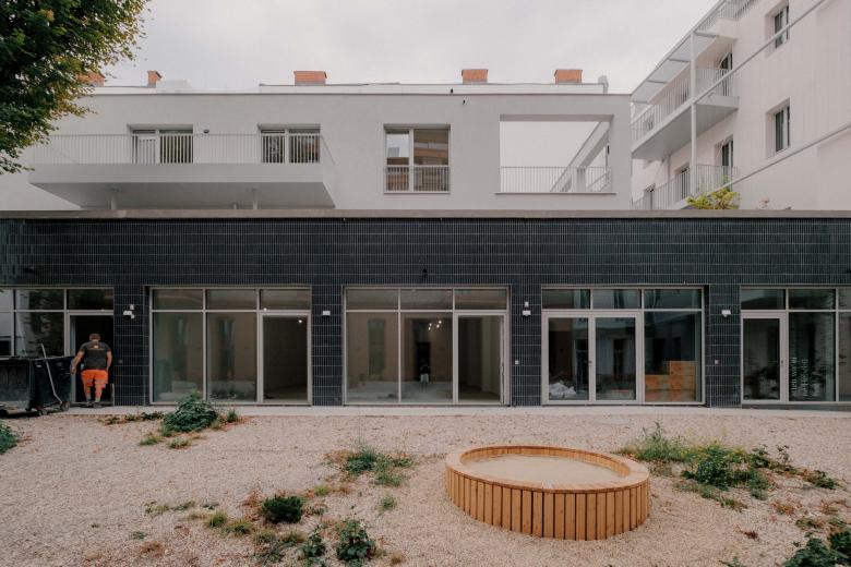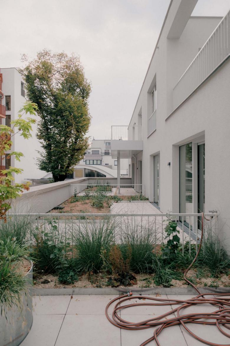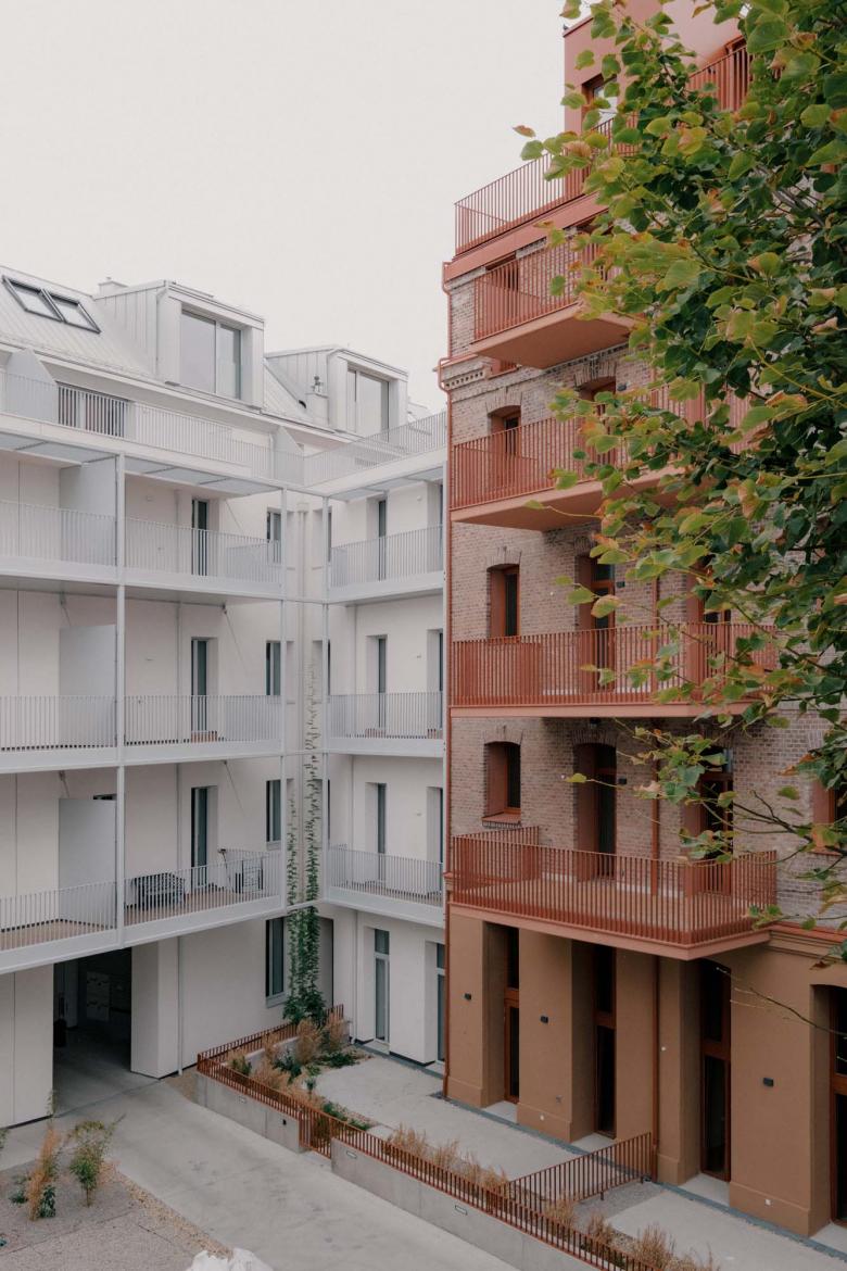 Den straßenseitigen Eingang in das Quartier markiert ein klassisches, jedoch bereits entstucktes Zinshaus aus der Jahrhundertwende. Im Hof dominiert die industriell anmutende Backsteinfassade eines ehemaligen Walzwerks und Saatgutlagers. Demgegenüber liegt ein zweigeschoßiger Büro,- und Garagentrakt aus den frühen Fünfzigerjahren, der in seiner Kleinmaßstäblichkeit im Kontrast zur umliegenden Bebauung steht. Der östlich gelegene Neubau komplettiert schließlich das Ensemble und fasst den Innenhof räumlich ein.