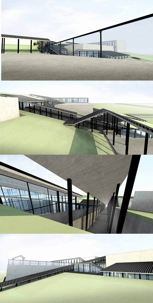 For the limitation of acreage and height, the base is close to the lakeside. We hope that the huge volume of the building can disappear to the greatest extent. So we construct a continuing hoist of the plaza floor that form a slope to cover the most of the volume of the building, and the remains that stand out of the slope form a light and thin layer combined with small houses, corridors, yards, and platforms.