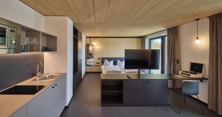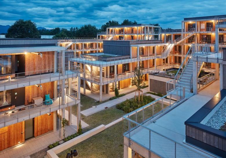 In Rosenheim ist mit dem CampusRO ein Leuchtturmprojekt entstanden. Der Neubau bietet Studierenden mit mehr als 200 Apartments und einem Boardinghaus mit 40 weiteren Apartments dort Wohn- und Lebensraum in unmittelbarer Nähe der Hochschule. Das Konzept in einer Art Siedlungsstruktur fördert das Miteinander. Die Gruppierung der Gebäude erzeugt nach außen eine blockähnliche, klare Kontur und konzentriert im Inneren den vielfältigen Lebensraum der Wohngemeinschaft. Der ganzheitliche und innovative Ansatz wurde durch einen optimierten Bauablauf und einen hohen Energiestandard geprägt. Darüber hinaus trug der Baustoff Holz durch eine werkseitige Vorfertigung der Holztafelelemente zu einer Bauzeitverkürzung. Die Wände wurden in Holz-Rahmenbauweise erstellt, die Außenbekleidung besteht aus einer hinterlüfteten Holzschalung. Decken- und Dachkonstruktion wurden in Holz-Beton-Verbund errichtet. Unser Projekt ist DGNB Platin zertifiziert.