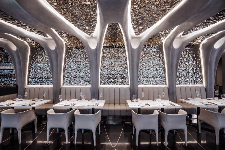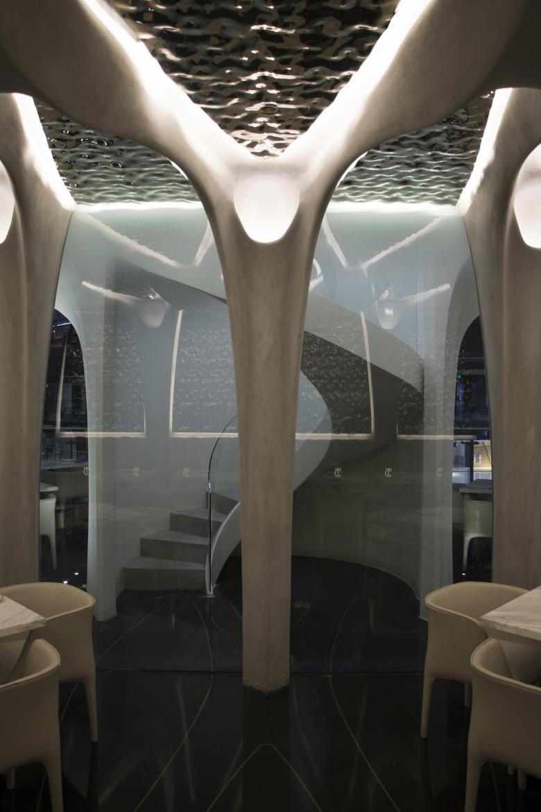 Stepping into the restaurant, you are as if placed in the secret environment of the holy church. The concrete skeleton structure forms a new space system, which is interwoven and enclosed, and extends with layers like an illusion. From the simple rectangular space to the endless fantasy cave, the reconstructed skeleton structure blocks the surrounding shopping mall environment, instantly pulling you into a surreal dream, and gradually silences the noisy atmosphere.