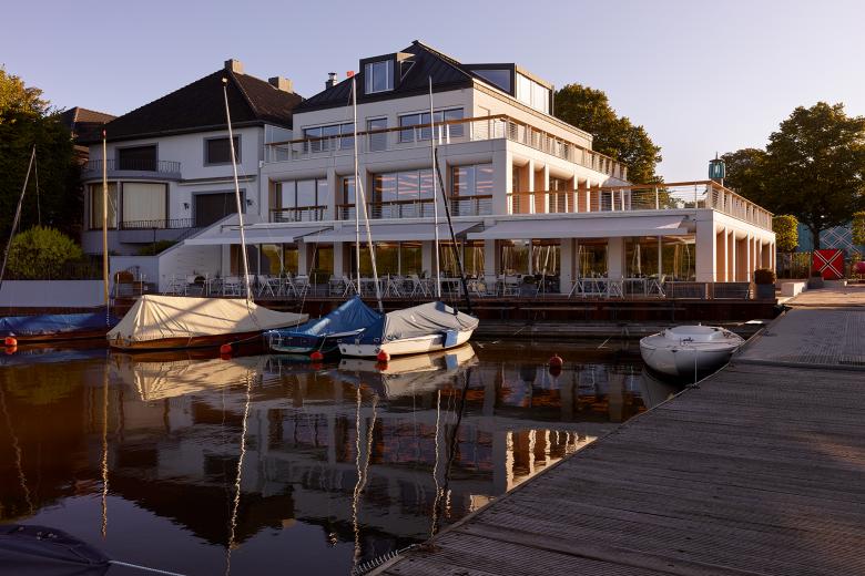 Unter Beibehaltung der historisch gewachsenen Kubatur wurde ein Neubau geschaffen, welcher zwischen Moderne und Tradition tariert, als Vermittler zwischen Nachwuchs und alteingesessenen Hanseaten fungiert. Der deutlich vergrößerte Jugendbereich der „Alsterpiraten“, welcher im großflächigen Untergeschoss liegt ist nur ein Beispiel für das gelungene Zusammenspiel der Generationen in dem neuen Clubhaus. Das neu entwickelte, hinterleuchtete Deckenraster ermöglicht Etablierten und Eingeweihten die Struktur und Baugeschichte der historischen Villa nach zu vollziehen und schafft ein harmonisches Ambiente zum Wohlfühlen. Der große, gehobene Gastronomiebereich mit der „roter Bar“ und dem lauschigen Kaminzimmer bilden das Kommunikative Zentrum des Vereines und bestechen mit einem großartigen Blick auf die Alster und das Stadtpanorama. Im ersten Obergeschoss befindet sich ein, dank mobiler Wandelemente flexibel nutzbarer, Festsaal mit großer Außenterrasse, welcher sich auch bei vereinsexternen großer Beliebtheit erfreut. Die lichtdurchfluteten Büros der Verwaltung im Obergeschoss, ergänzen das Raumprogramm. Im Dachgeschoss wurde ein Sitzungsraum für den Vorstand geschaffen, welcher dank zwei großflächigen Gauben einen unvergleichbaren Ausblick auf Hamburg und die Alster bietet. Die Küche der Gastronomie liegt neben Serviceräumen, den umfassenden Archiven, dem Jugendraum und der Bootswerkstatt im Untergeschoss.